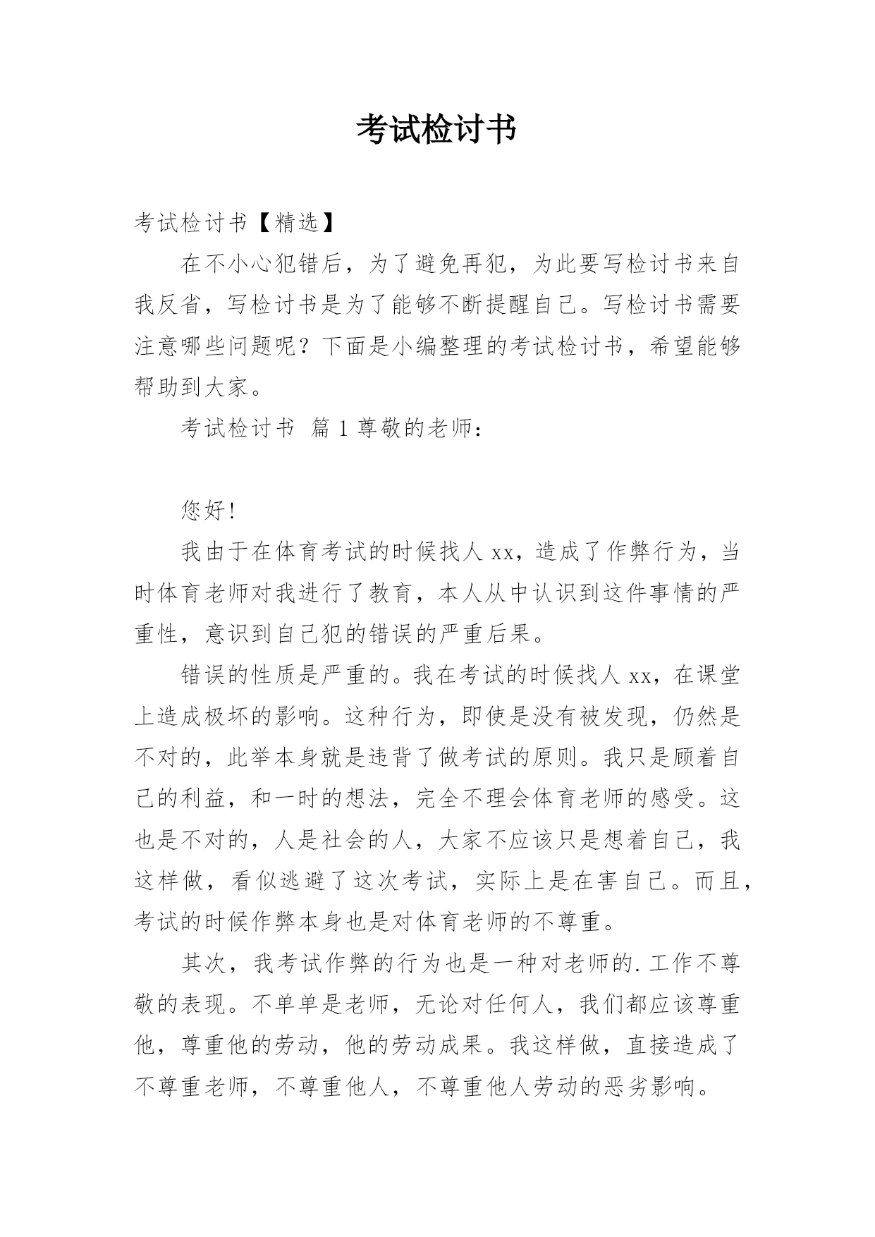 考试检讨书考试检讨书【精选】在不小心犯错后,为了避免再犯,为此要写检讨书来自我反省,写检讨书是为了能够不断提醒自己。写检讨书需要注意哪些问题呢?下面是小编整理的考试检讨书,希望能够帮助到大家。考试检讨书篇1尊敬的老师:您好!我由于在体育考试的时候找人xx,造成了作弊行为,当时体育老师对我进行了教育,本人从中认识到这件事情的严重性,意识到自己犯的错误的严重后果。错误的性质是严重的。我在考试的时候找人xx,在课堂上造成极坏的影响。这种行为,即使是没有被发现,仍然是不对的,此举本身就是违背了做考试的原则。我只是