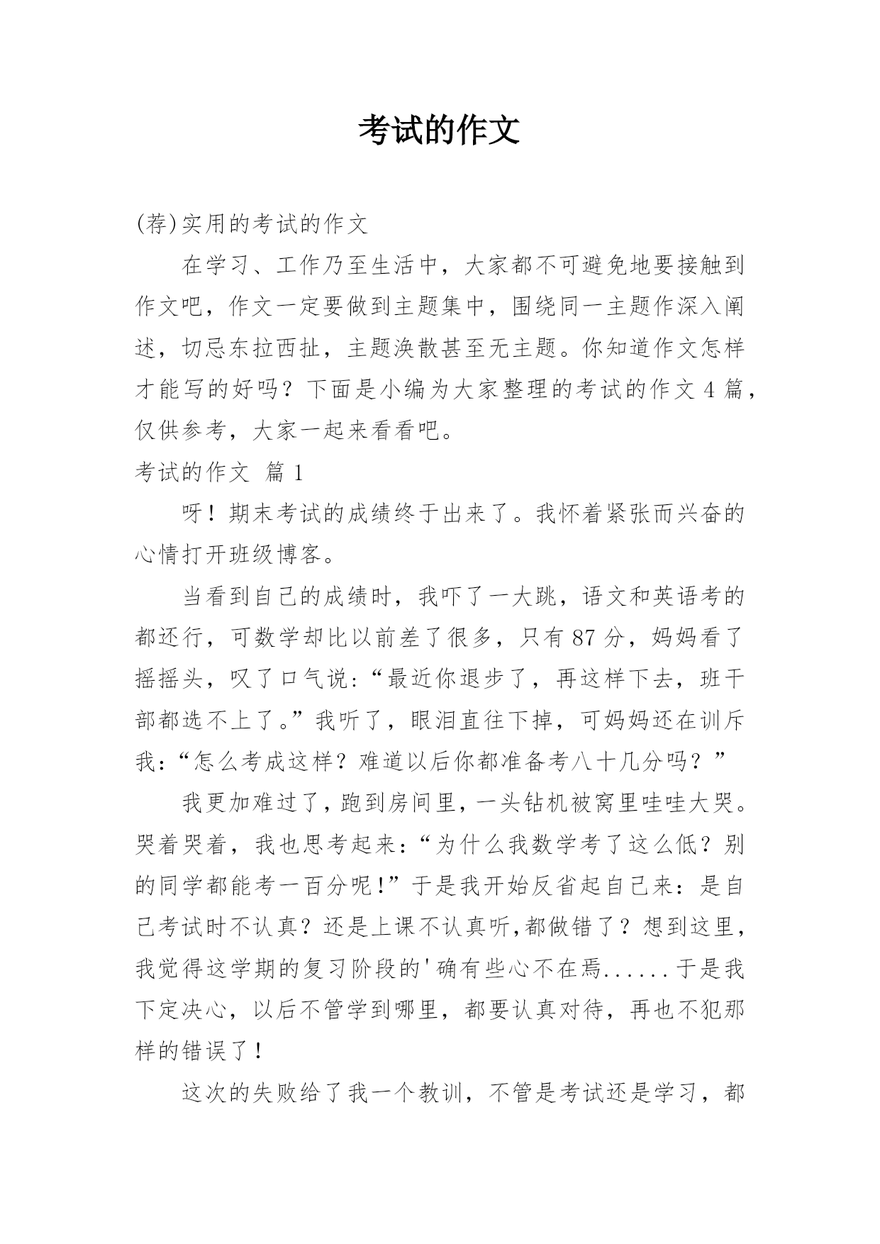 考试的作文(荐)实用的考试的作文在学习、工作乃至生活中,大家都不可避免地要接触到作文吧,作文一定要做到主题集中,围绕同一主题作深入阐述,切忌东拉西扯,主题涣散甚至无主题。你知道作文怎样才能写的好吗?下面是小编为大家整理的考试的作文4篇,仅供参考,大家一起来看看吧。考试的作文篇1呀!期末考试的成绩终于出来了。我怀着紧张而兴奋的心情打开班级博客。当看到自己的成绩时,我吓了一大跳,语文和英语考的都还行,可数学却比以前差了很多,只有87分,妈妈看了摇摇头,叹了口气说:“最近你退步了,再这样下去,班干部都选不上了。