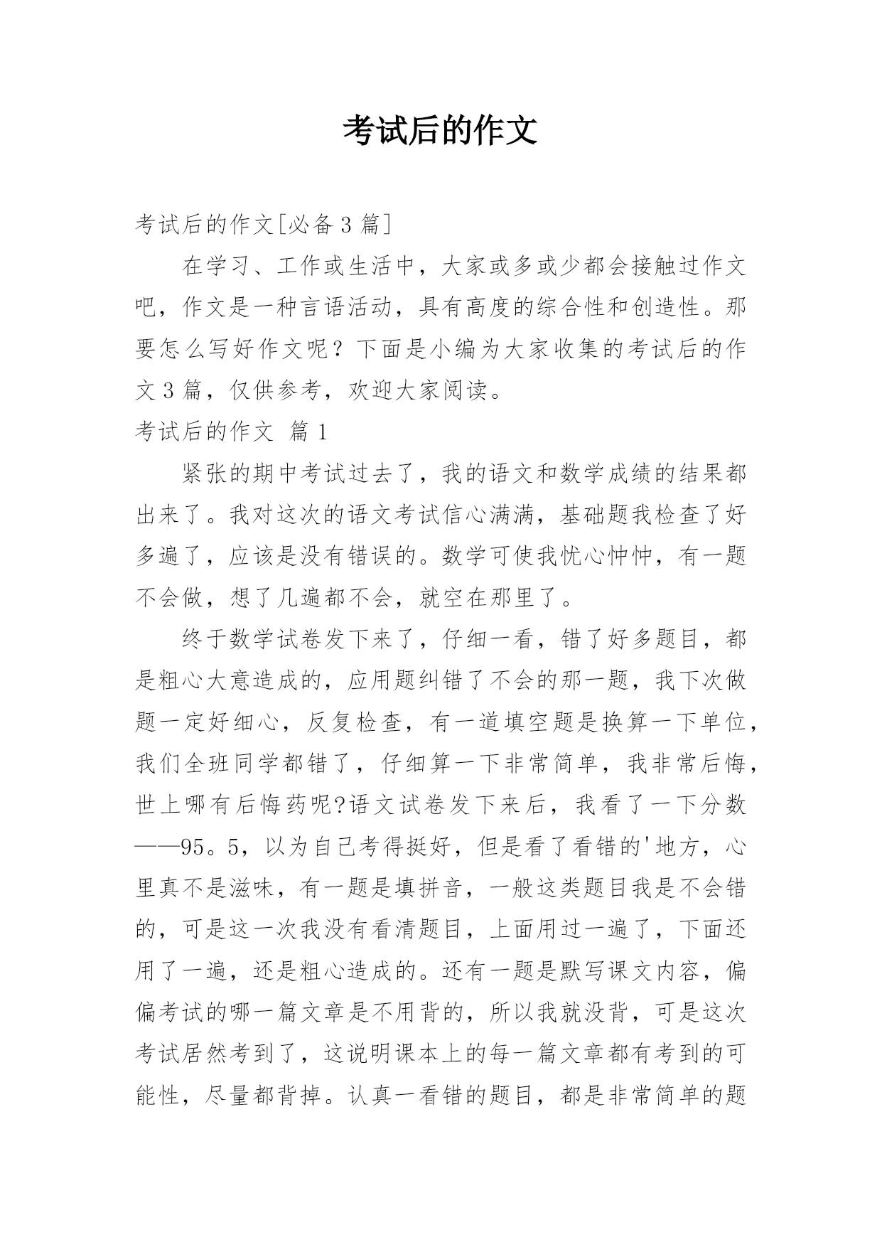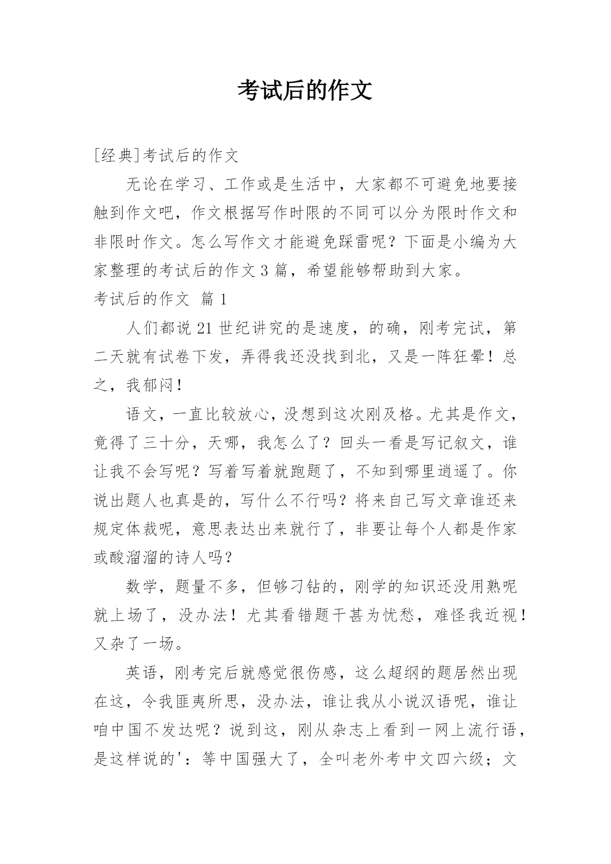 考试后的作文[经典]考试后的作文无论在学习、工作或是生活中,大家都不可避免地要接触到作文吧,作文根据写作时限的不同可以分为限时作文和非限时作文。怎么写作文才能避免踩雷呢?下面是小编为大家整理的考试后的作文3篇,希望能够帮助到大家。考试后的作文篇1人们都说21世纪讲究的是速度,的确,刚考完试,第二天就有试卷下发,弄得我还没找到北,又是一阵狂晕!总之,我郁闷!语文,一直比较放心,没想到这次刚及格。尤其是作文,竟得了三十分,天哪,我怎么了?回头一看是写记叙文,谁让我不会写呢?写着写着就跑题了,不知到哪里逍遥了。