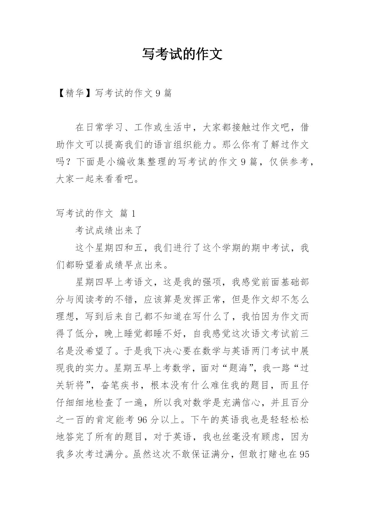 考试的作文考试的作文(必备3篇)在日常生活或是工作学习中,说到作文,大家肯定都不陌生吧,作文是经过人的思想考虑和语言组织,通过文字来表达一个主题意义的记叙方法。还是对作文一筹莫展吗?以下是小编为大家收集的考试的作文3篇,欢迎大家分享。考试的作文篇1每个人都有最烦恼的事情,在我的生活中,考试就是我最烦恼的事,我想应该有人也跟我一样吧!考试前,老师会不停地催促我们要加紧复习,让我们取得更好的成绩。这些话我听得耳朵都起茧子了,而且感觉就算老师反复这样说,我们也不会真的有很大的进步。考试时,我最害怕做错题目,特别