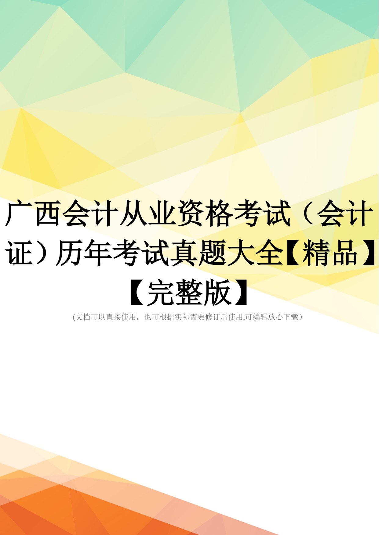 广西会计从业资格考试(会计证)历年考试真题大全【精品】【完整版】(文档可以直接使用,也可根据实际需要修订后使用,可编辑放心下载)广西会计从业资格考试〔会计证〕历年考试真题大全2002年广西会计从业考试?会计根底?试题和答案2002年广西会计从业考试?财经法规?真题和答案2005年广西会计从业资格考试?会计根底?试题和答案2006年广西会计从业资格考试?会计根底?试题和答案2006年广西会计从业资格考试财经法规与会计职业道德试题和答案2007年广西会计从业资格考试?会计根底?试题和答案2007年广西会计从业