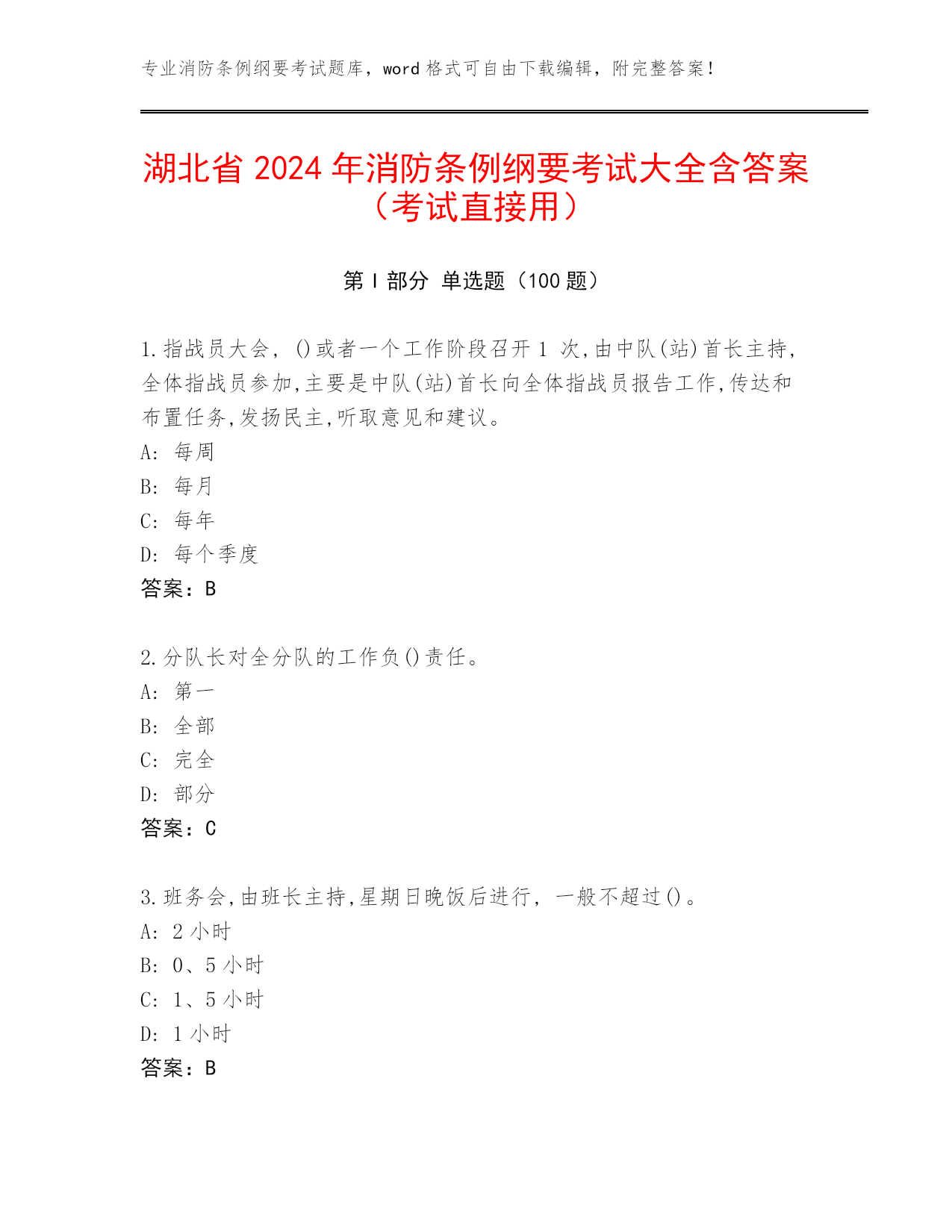 专业消防条例纲要考试题库,word格式可自由下载编辑,附完整答案!湖北省2024年消防条例纲要考试大全含答案(考试直接用)第I部分单选题(100题)1.指战员大会,()或者一个工作阶段召开1次,由中队(站)首长主持,全体指战员参加,主要是中队(站)首长向全体指战员报告工作,传达和布置任务,发扬民主,听取意见和建议。A:每周B:每月C:每年D:每个季度答案:B2.分队长对全分队的工作负()责任。A:第一B:全部C:完全D:部分答案:C3.班务会,由班长主持,星期日晚饭后进行,一般不超过()。A:2小时B:0