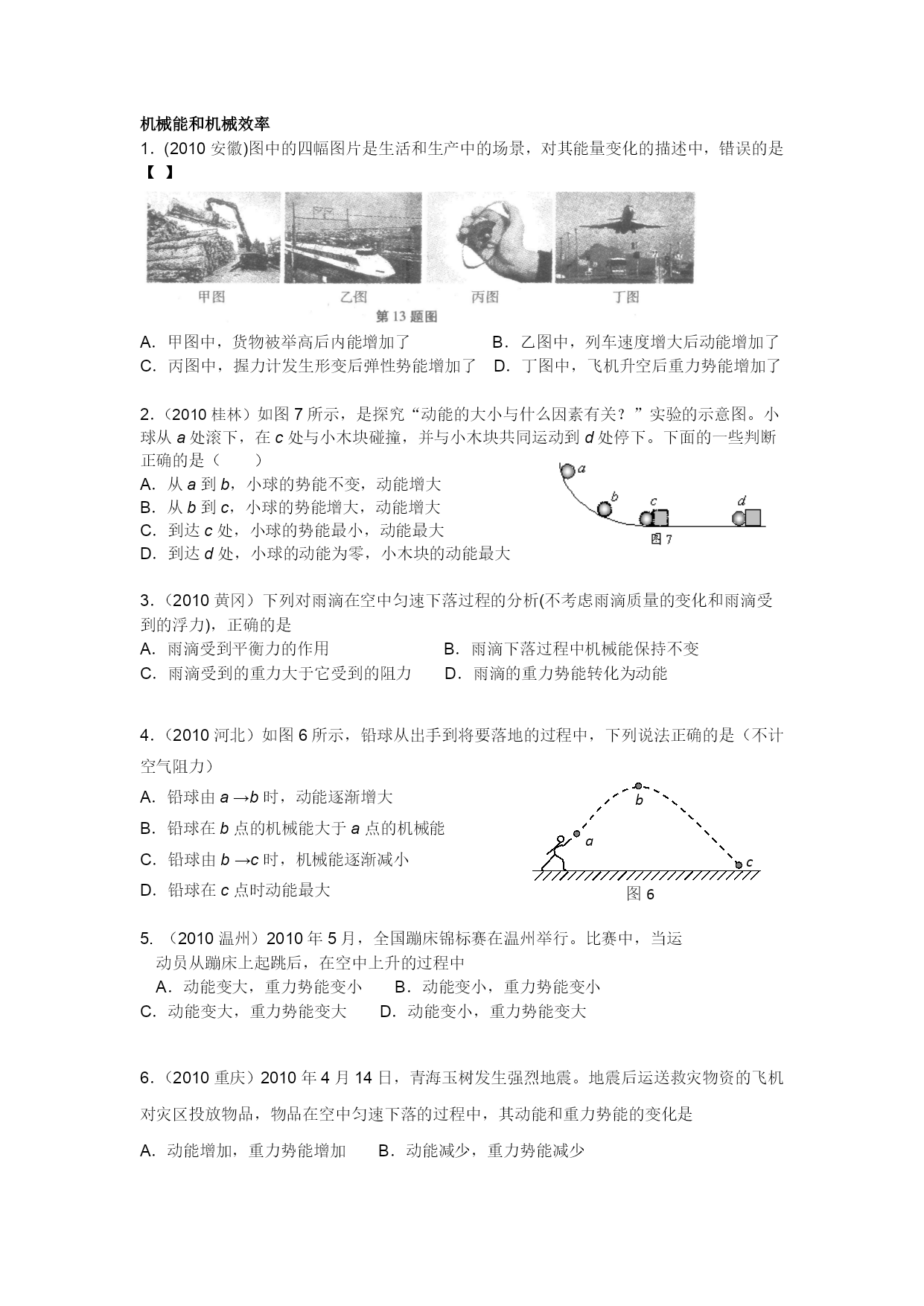 机械能和机械效率1.(2010安徽)图中的四幅图片是生活和生产中的场景,对其能量变化的描述中,错误的是【】A.甲图中,货物被举高后内能增加了B.乙图中,列车速度增大后动能增加了C.丙图中,握力计发生形变后弹性势能增加了D.丁图中,飞机升空后重力势能增加了2.(2010桂林)如图7所示,是探究“动能的大小与什么因素有关?”实验的示意图。小球从a处滚下,在c处与小木块碰撞,并与小木块共同运动到d处停下。下面的一些判断正确的是()A.从a到b,小球的势能不变,动能增大B.从b到c,小球的势能增大,动能增大C.到