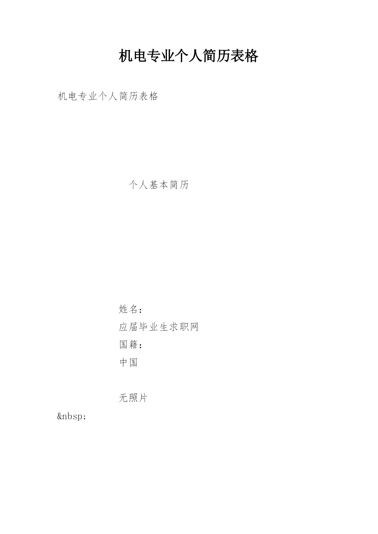 机电专业个人简历表格机电专业个人简历表格个人基本简历姓名:应届毕业生求职网国籍:中国无照片 目前所在地:广州民族:汉族户口所在地:湛江身材:174cm?67kg婚姻状况:已婚年龄:25岁培训认证: 诚信徽章: 求职意向及工作经历人才类型:普通求职?应聘职位:市场销售/营销类:营销主管、销售汽车类销售机械/设备维修类营销工作年限:7职称:无职称求职类型:全职可到职-随时月薪要求:2000--3500希望工作地区:广州个人工作经历:2006.3-2007.12 广州车路