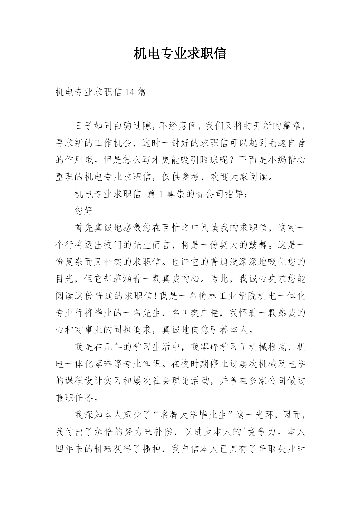 机电专业求职信机电专业求职信14篇日子如同白驹过隙,不经意间,我们又将打开新的篇章,寻求新的工作机会,这时一封好的求职信可以起到毛遂自荐的作用哦。但是怎么写才更能吸引眼球呢?下面是小编精心整理的机电专业求职信,仅供参考,欢迎大家阅读。机电专业求职信篇1尊崇的贵公司指导:您好首先真诚地感激您在百忙之中阅读我的求职信,这对一个行将迈出校门的先生而言,将是一份莫大的鼓舞。这是一份复杂而又朴实的求职信。也许它的普通没深深地吸住您的目光,但它却蕴涵着一颗真诚的心。为此,我诚心央求您能阅读这份普通的求职信!我是一名榆
