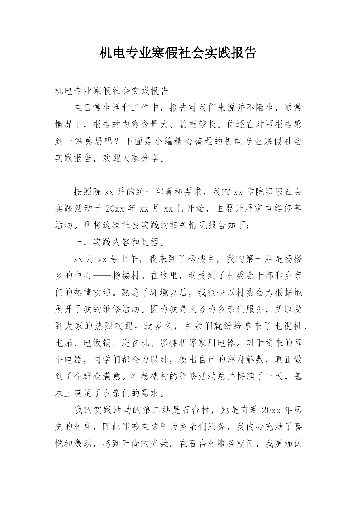 机电专业寒假社会实践报告机电专业寒假社会实践报告在日常生活和工作中,报告对我们来说并不陌生,通常情况下,报告的内容含量大、篇幅较长。你还在对写报告感到一筹莫展吗?下面是小编精心整理的机电专业寒假社会实践报告,欢迎大家分享。按照院xx系的统一部署和要求,我的xx学院寒假社会实践活动于20xx年xx月xx日开始,主要开展家电维修等活动。现将这次社会实践的相关情况报告如下:一,实践内容和过程。xx月xx号上午,我来到了杨楼乡,我的第一站是杨楼乡的中心——杨楼村。在这里,我受到了村委会干部和乡亲们的热情欢迎。熟悉