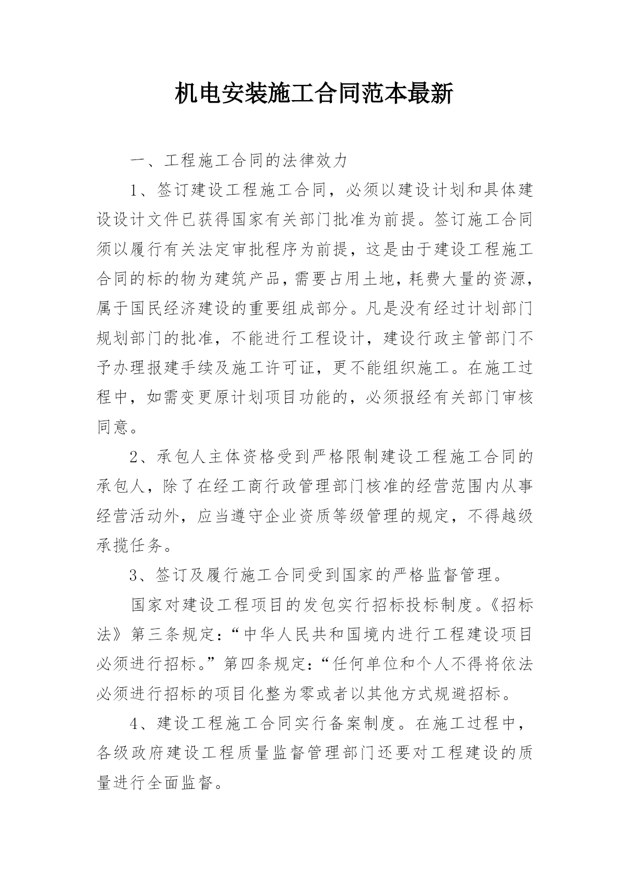 机电安装施工合同范本最新一、工程施工合同的法律效力1、签订建设工程施工合同,必须以建设计划和具体建设设计文件已获得国家有关部门批准为前提。签订施工合同须以履行有关法定审批程序为前提,这是由于建设工程施工合同的标的物为建筑产品,需要占用土地,耗费大量的资源,属于国民经济建设的重要组成部分。凡是没有经过计划部门规划部门的批准,不能进行工程设计,建设行政主管部门不予办理报建手续及施工许可证,更不能组织施工。在施工过程中,如需变更原计划项目功能的,必须报经有关部门审核同意。2、承包人主体资格受到严格限制建设工程施