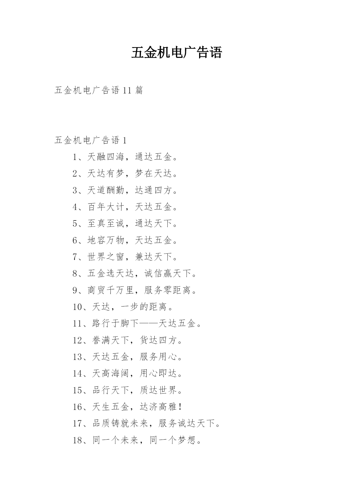 五金机电广告语五金机电广告语11篇五金机电广告语11、天融四海,通达五金。2、天达有梦,梦在天达。3、天道酬勤,达通四方。4、百年大计,天达五金。5、至真至诚,通达天下。6、地容万物,天达五金。7、世界之窗,兼达天下。8、五金选天达,诚信赢天下。9、商贸千万里,服务零距离。10、天达,一步的距离。11、路行于脚下——天达五金。12、誊满天下,货达四方。13、天达五金,服务用心。14、天高海阔,用心即达。15、品行天下,质达世界。16、天生五金,达济高雅!17、品质铸就未来,服务诚达天下。18、同一个未来,