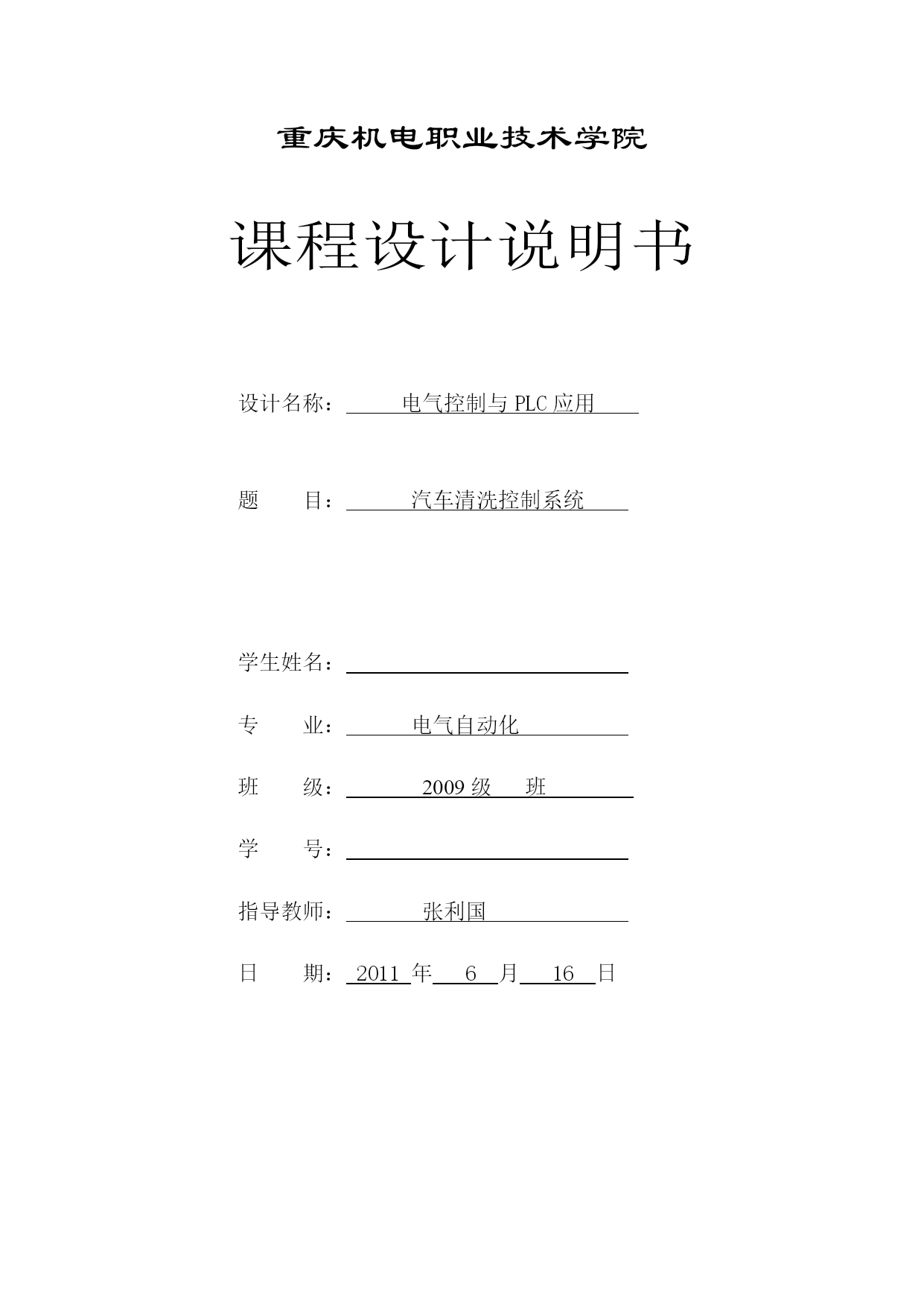 重庆机电职业技术学院课程设计说明书设计名称:电气控制与PLC应用题目:汽车清洗控制系统学生姓名:专业:电气自动化班级:2009级班学号:指导教师:张利国日期:2011年6月16日重庆机电职业技术学院课程设计任务书机电一体化专业2009年级班一、设计题目汽车清洗控制系统二、主要内容1、动作要求①若方式选择开关(COS)置于手动方式,当按下START启动按钮后,按下列程序动作:执行泡沫清洗(用MC1驱动);按PB1按钮则执行清水冲洗(用MC2驱动);按PB2按钮则执行风干(用MC3驱动);按PB3则结束洗车。