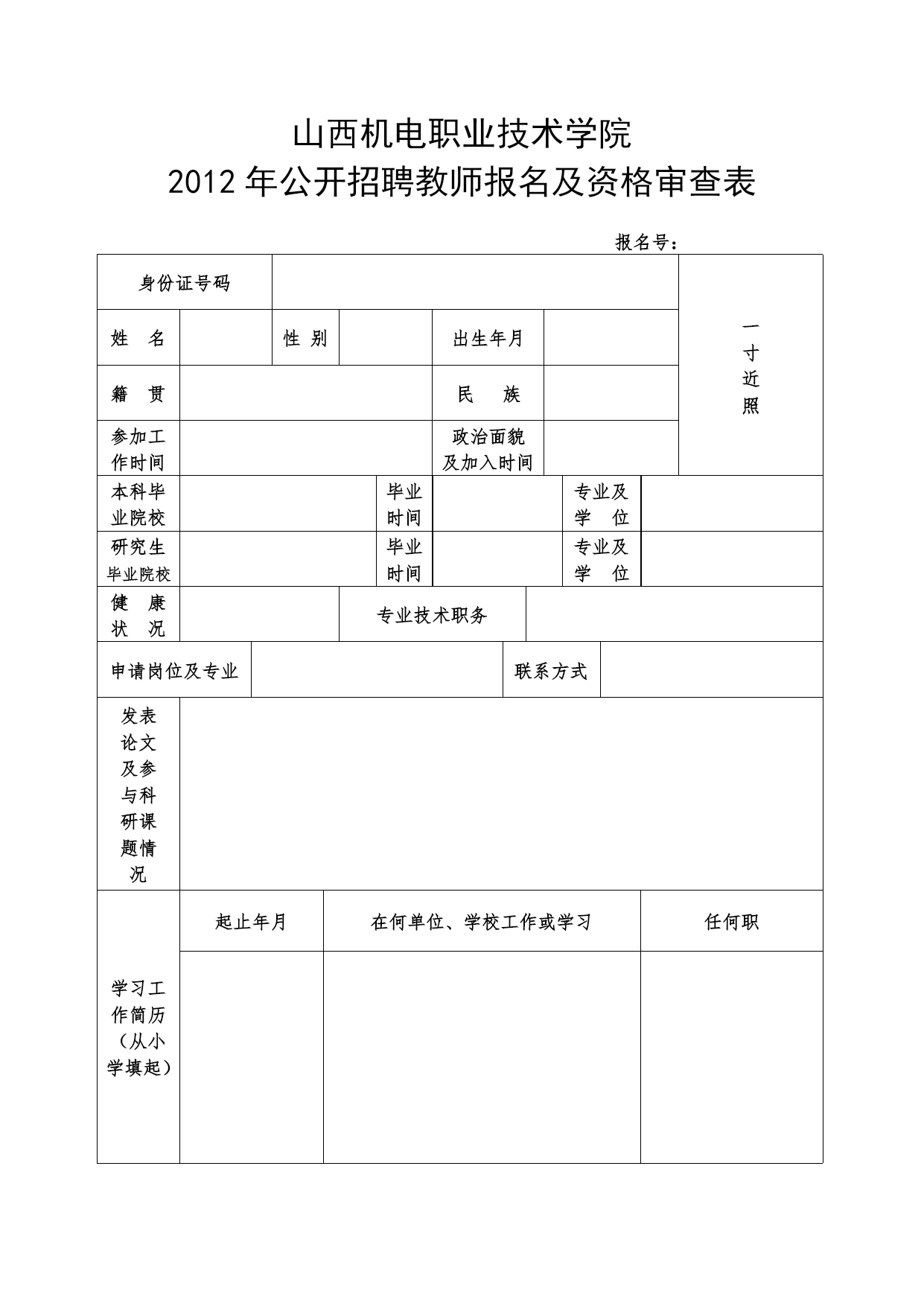 山西机电职业技术学院2012年公开招聘教师报名及资格审查表报名号:身份证号码一寸近照姓名性别出生年月籍贯民族参加工作时间政治面貌及加入时间本科毕业院校毕业时间专业及学位研究生毕业院校毕业时间专业及学位健康状况专业技术职务申请岗位及专业联系方式发表论文及参与科研课题情况学习工作简历(从小学填起)起止年月在何单位、学校工作或学习任何职家庭成员情况称谓姓名年龄政治面貌工作单位任何职加分情况大学生村干部□高等学校毕业生“三支一扶”计划□大学生志愿服务西部计划□农村义务教育阶段学校教师特设岗位计划□承诺本人提供的证