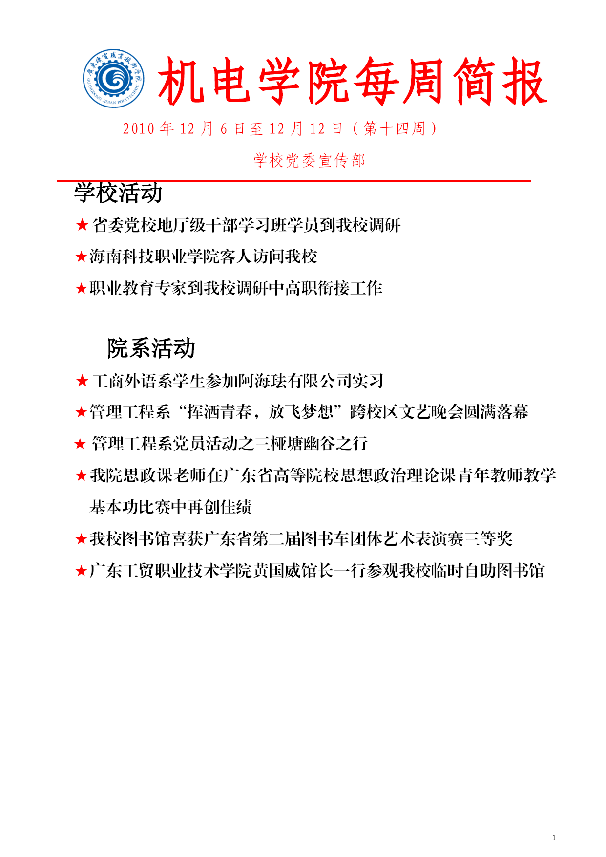 PAGEPAGE8机电学院每周简报2010年12月6日至12月12日(第十四周)学校党委宣传部学校活动★省委党校地厅级干部学习班学员到我校调研★海南科技职业学院客人访问我校★职业教育专家到我校调研中高职衔接工作院系活动★工商外语系学生参加阿海珐有限公司实习★管理工程系“挥洒青春,放飞梦想”跨校区文艺晚会圆满落幕管理工程系党员活动之三桠塘幽谷之行★我院思政课老师在广东省高等院校思想政治理论课青年教师教学基本功比赛中再创佳绩★我校图书馆喜获广东省第二届图书车团体艺术表演赛三等奖★广东工贸职业技术学