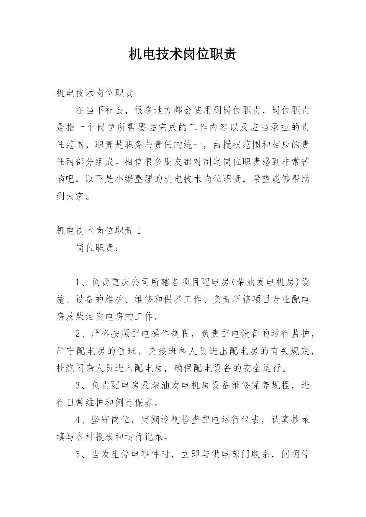 机电技术岗位职责机电技术岗位职责在当下社会,很多地方都会使用到岗位职责,岗位职责是指一个岗位所需要去完成的工作内容以及应当承担的责任范围,职责是职务与责任的统一,由授权范围和相应的责任两部分组成。相信很多朋友都对制定岗位职责感到非常苦恼吧,以下是小编整理的机电技术岗位职责,希望能够帮助到大家。机电技术岗位职责1岗位职责:1、负责重庆公司所辖各项目配电房(柴油发电机房)设施、设备的维护、维修和保养工作、负责所辖项目专业配电房及柴油发电房的工作。2、严格按照配电操作规程,负责配电设备的运行监护,严守配电房的值