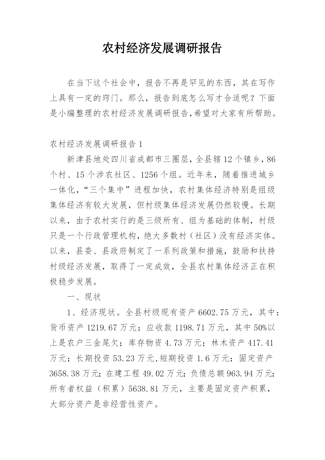 农村经济发展调研报告在当下这个社会中,报告不再是罕见的东西,其在写作上具有一定的窍门。那么,报告到底怎么写才合适呢?下面是小编整理的农村经济发展调研报告,希望对大家有所帮助。农村经济发展调研报告1新津县地处四川省成都市三圈层,全县辖12个镇乡,86个村、15个涉农社区、1256个组。近年来,随着推进城乡一体化,“三个集中”进程加快,农村集体经济特别是组级集体经济有较大发展,但村级集体经济发展仍然较慢。长期以来,由于农村实行的是三级所有、组为基础的体制,村级只是一个行政管理机构,绝大多数村(社区)没有经济实