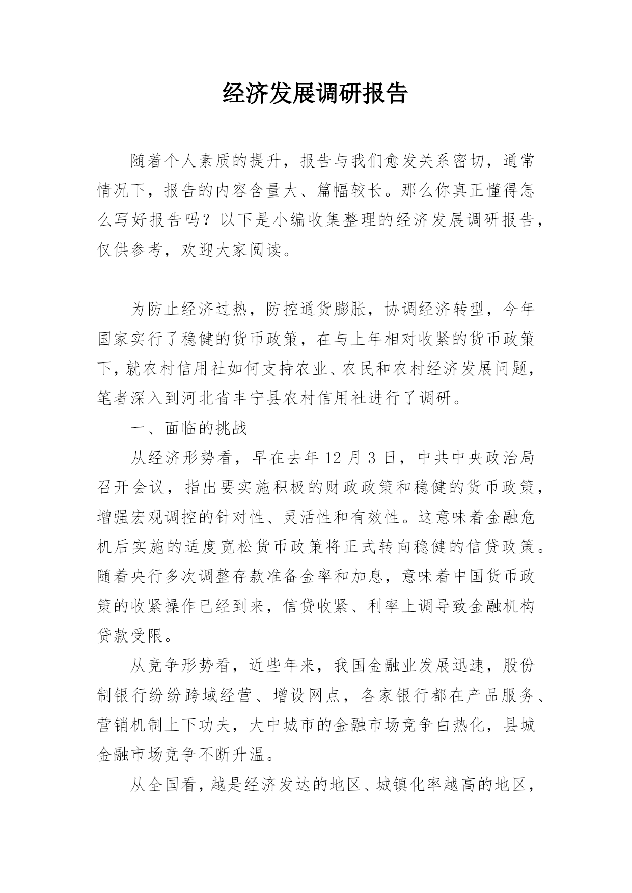 经济发展调研报告随着个人素质的提升,报告与我们愈发关系密切,通常情况下,报告的内容含量大、篇幅较长。那么你真正懂得怎么写好报告吗?以下是小编收集整理的经济发展调研报告,仅供参考,欢迎大家阅读。为防止经济过热,防控通货膨胀,协调经济转型,今年国家实行了稳健的货币政策,在与上年相对收紧的货币政策下,就农村信用社如何支持农业、农民和农村经济发展问题,笔者深入到河北省丰宁县农村信用社进行了调研。一、面临的挑战从经济形势看,早在去年12月3日,中共中央政治局召开会议,指出要实施积极的财政政策和稳健的货币政策,增强宏