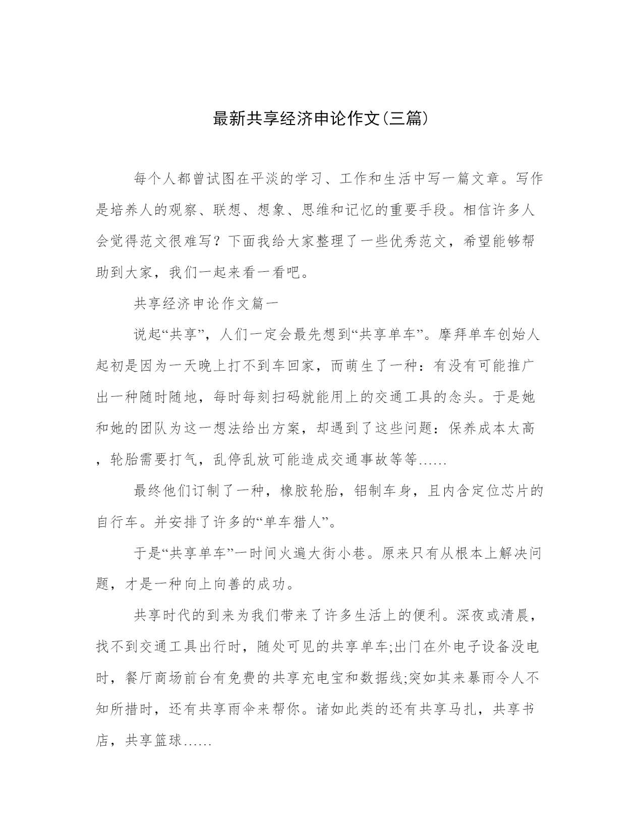 最新共享经济申论作文(三篇)每个人都曾试图在平淡的学习、工作和生活中写一篇文章。写作是培养人的观察、联想、想象、思维和记忆的重要手段。相信许多人会觉得范文很难写?下面我给大家整理了一些优秀范文,希望能够帮助到大家,我们一起来看一看吧。共享经济申论作文篇一说起“共享”,人们一定会最先想到“共享单车”。摩拜单车创始人起初是因为一天晚上打不到车回家,而萌生了一种:有没有可能推广出一种随时随地,每时每刻扫码就能用上的交通工具的念头。于是她和她的团队为这一想法给出方案,却遇到了这些问题:保养成本太高,轮胎需要打气,