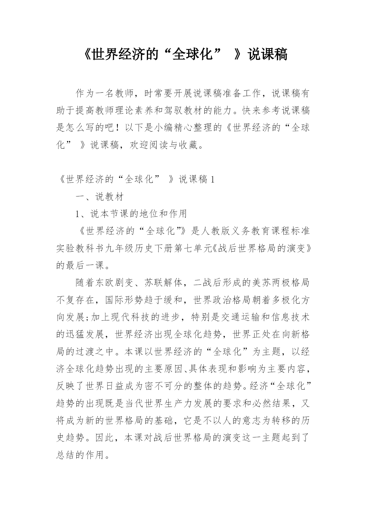 《世界经济的“全球化”》说课稿作为一名教师,时常要开展说课稿准备工作,说课稿有助于提高教师理论素养和驾驭教材的能力。快来参考说课稿是怎么写的吧!以下是小编精心整理的《世界经济的“全球化”》说课稿,欢迎阅读与收藏。《世界经济的“全球化”》说课稿1一、说教材1、说本节课的地位和作用《世界经济的“全球化”》是人教版义务教育课程标准实验教科书九年级历史下册第七单元《战后世界格局的演变》的最后一课。随着东欧剧变、苏联解体,二战后形成的美苏两极格局不复存在,国际形势趋于缓和,世界政治格局朝着多极化方向发展;加上现代科