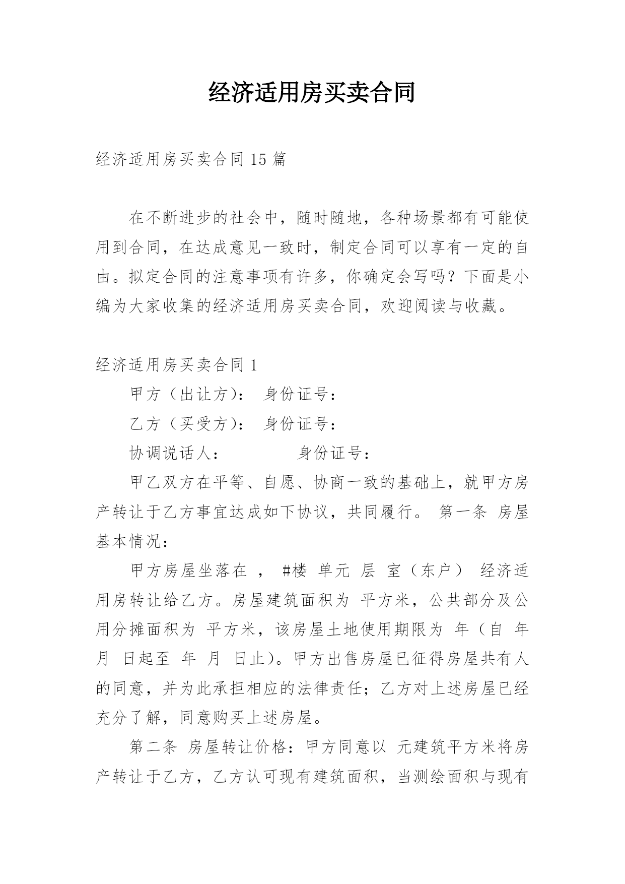 经济适用房买卖合同经济适用房买卖合同15篇在不断进步的社会中,随时随地,各种场景都有可能使用到合同,在达成意见一致时,制定合同可以享有一定的自由。拟定合同的注意事项有许多,你确定会写吗?下面是小编为大家收集的经济适用房买卖合同,欢迎阅读与收藏。经济适用房买卖合同1甲方(出让方):身份证号:乙方(买受方):身份证号:协调说话人:身份证号:甲乙双方在平等、自愿、协商一致的基础上,就甲方房产转让于乙方事宜达成如下协议,共同履行。第一条房屋基本情况:甲方房屋坐落在,#楼单元层室(东户)经济适用房转让给乙方。房屋建