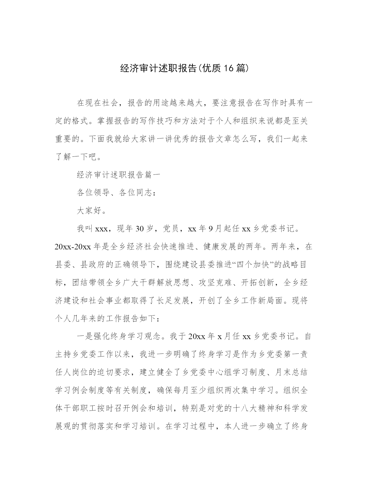 经济审计述职报告(优质16篇)在现在社会,报告的用途越来越大,要注意报告在写作时具有一定的格式。掌握报告的写作技巧和方法对于个人和组织来说都是至关重要的。下面我就给大家讲一讲优秀的报告文章怎么写,我们一起来了解一下吧。经济审计述职报告篇一各位领导、各位同志:大家好。我叫xxx,现年30岁,党员,xx年9月起任xx乡党委书记。20xx-20xx年是全乡经济社会快速推进、健康发展的两年。两年来,在县委、县政府的正确领导下,围绕建设县委推进“四个加快”的战略目标,团结带领全乡广大干群解放思想、攻坚克难、开拓创新
