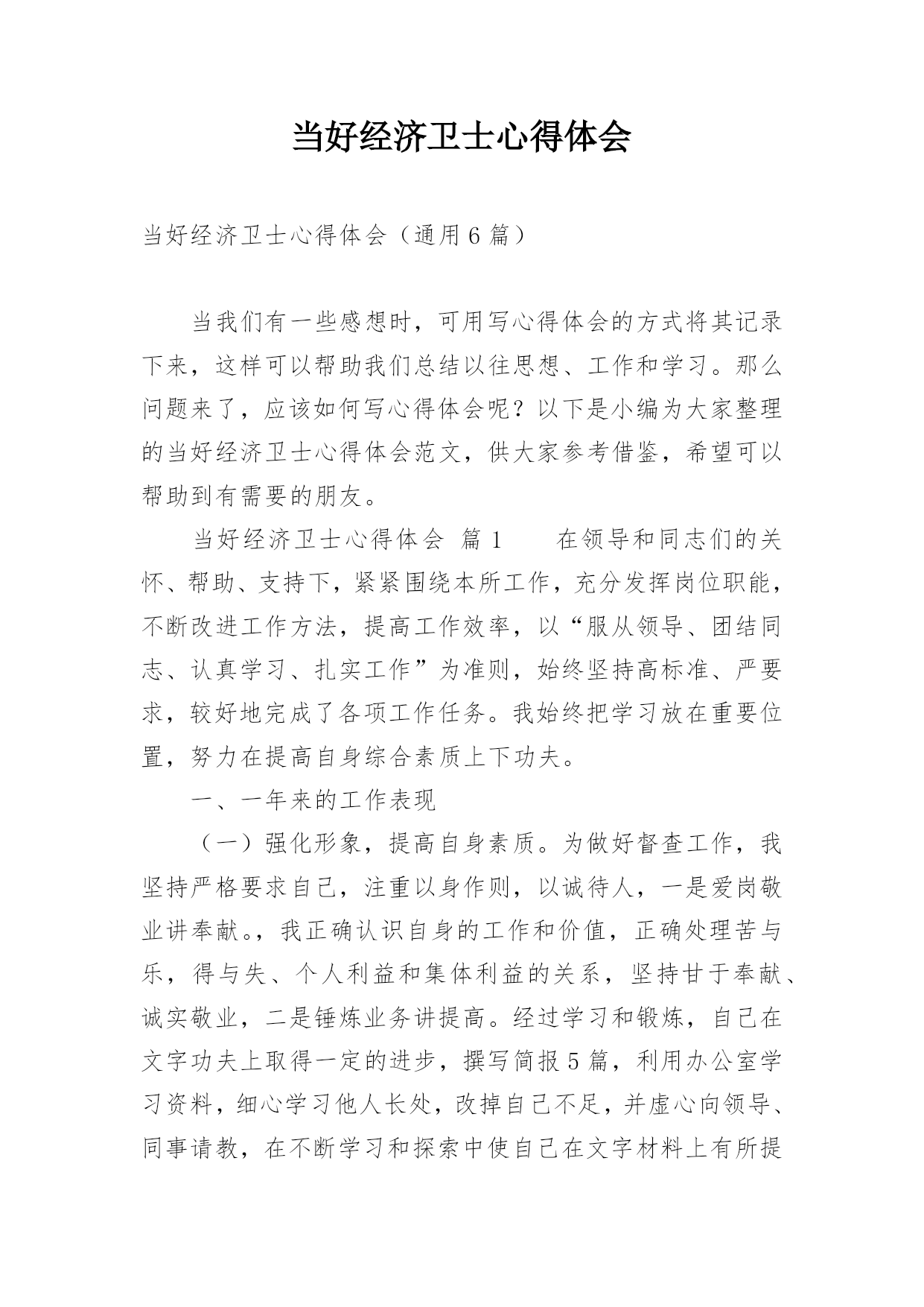 当好经济卫士心得体会当好经济卫士心得体会(通用6篇)当我们有一些感想时,可用写心得体会的方式将其记录下来,这样可以帮助我们总结以往思想、工作和学习。那么问题来了,应该如何写心得体会呢?以下是小编为大家整理的当好经济卫士心得体会范文,供大家参考借鉴,希望可以帮助到有需要的朋友。当好经济卫士心得体会篇1在领导和同志们的关怀、帮助、支持下,紧紧围绕本所工作,充分发挥岗位职能,不断改进工作方法,提高工作效率,以“服从领导、团结同志、认真学习、扎实工作”为准则,始终坚持高标准、严要求,较好地完成了各项工作任务。我始