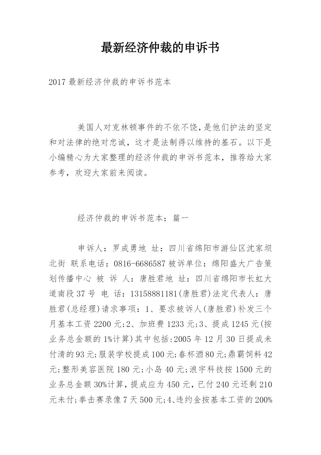 最新经济仲裁的申诉书2017最新经济仲裁的申诉书范本美国人对克林顿事件的不依不饶,是他们护法的坚定和对法律的绝对忠诚,这才是法制得以维持的基石。以下是小编精心为大家整理的经济仲裁的申诉书范本,推荐给大家参考,欢迎大家前来阅读。经济仲裁的申诉书范本:篇一申诉人:罗成勇地址:四川省绵阳市游仙区沈家坝北街联系电话:0816-6686587被诉单位:绵阳盛大广告策划传播中心被诉人:唐胜君地址:四川省绵阳市长虹大道南段37号电话:13158881181(唐胜君)法定代表人:唐胜君(总经理)请求事项:1、要求被诉人(