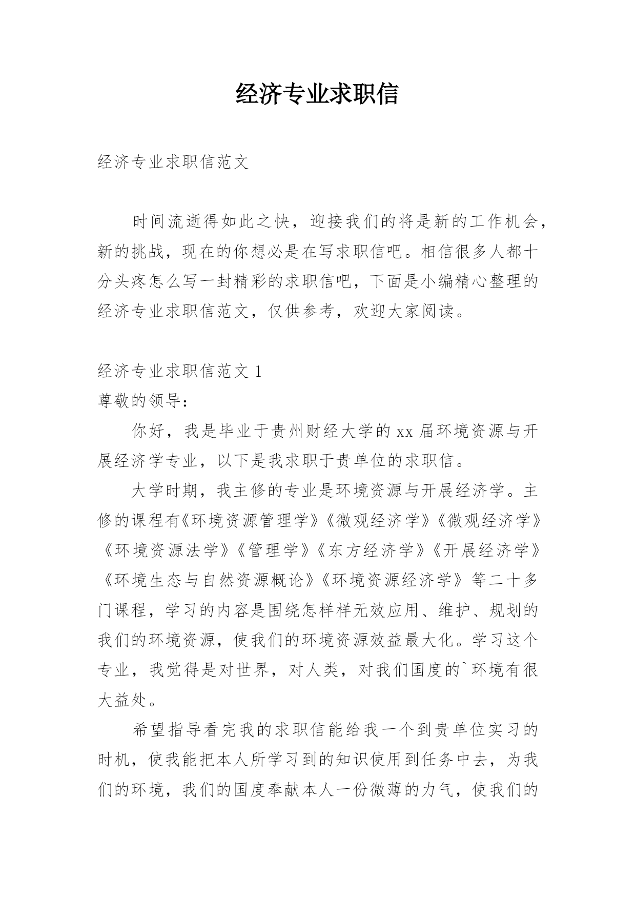 经济专业求职信经济专业求职信范文时间流逝得如此之快,迎接我们的将是新的工作机会,新的挑战,现在的你想必是在写求职信吧。相信很多人都十分头疼怎么写一封精彩的求职信吧,下面是小编精心整理的经济专业求职信范文,仅供参考,欢迎大家阅读。经济专业求职信范文1尊敬的领导:你好,我是毕业于贵州财经大学的xx届环境资源与开展经济学专业,以下是我求职于贵单位的求职信。大学时期,我主修的专业是环境资源与开展经济学。主修的课程有《环境资源管理学》《微观经济学》《微观经济学》《环境资源法学》《管理学》《东方经济学》《开展经济学》
