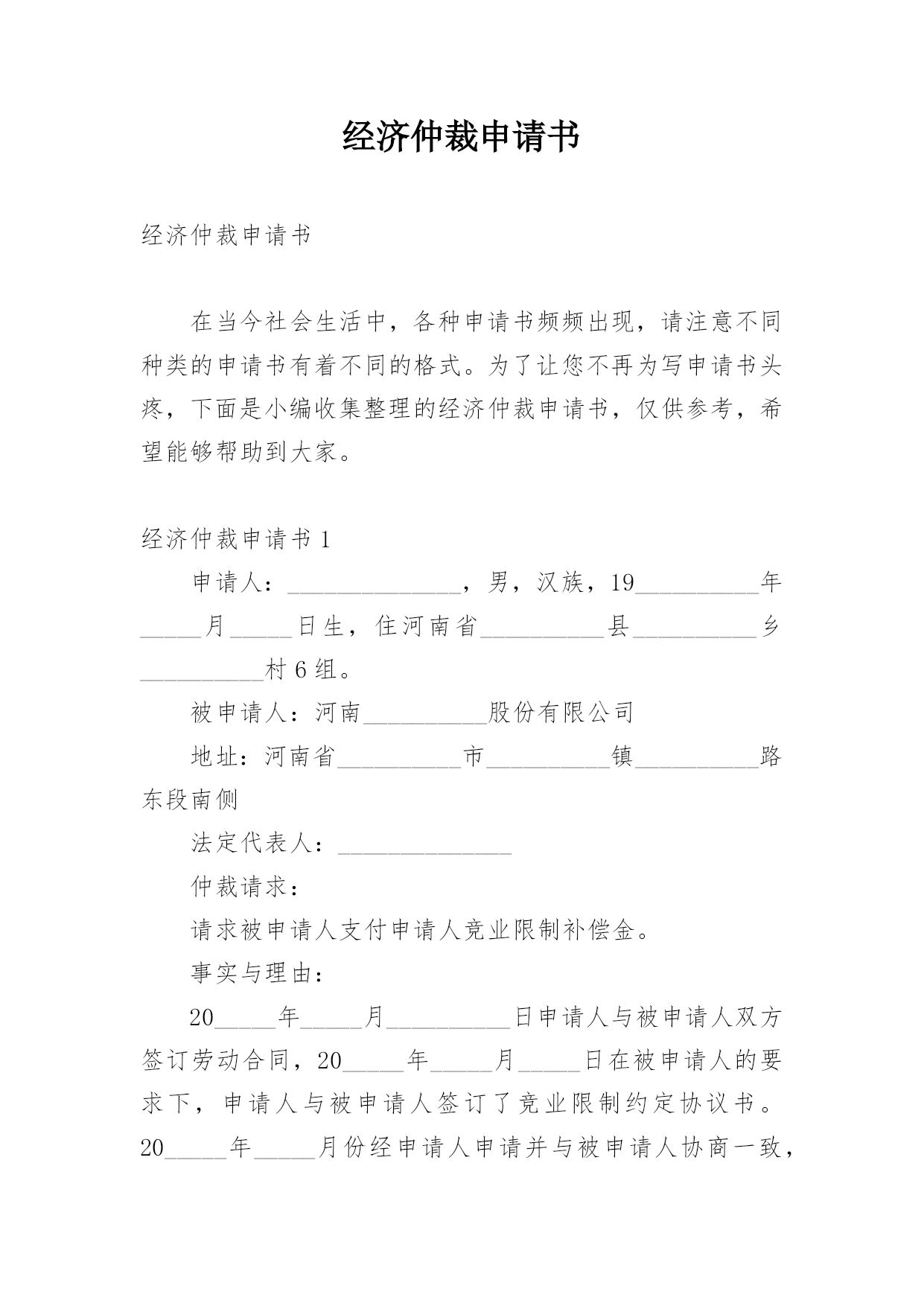 经济仲裁申请书经济仲裁申请书在当今社会生活中,各种申请书频频出现,请注意不同种类的申请书有着不同的格式。为了让您不再为写申请书头疼,下面是小编收集整理的经济仲裁申请书,仅供参考,希望能够帮助到大家。经济仲裁申请书1申请人:______________,男,汉族,19__________年_____月_____日生,住河南省__________县__________乡__________村6组。被申请人:河南__________股份有限公司地址:河南省__________市__________镇______