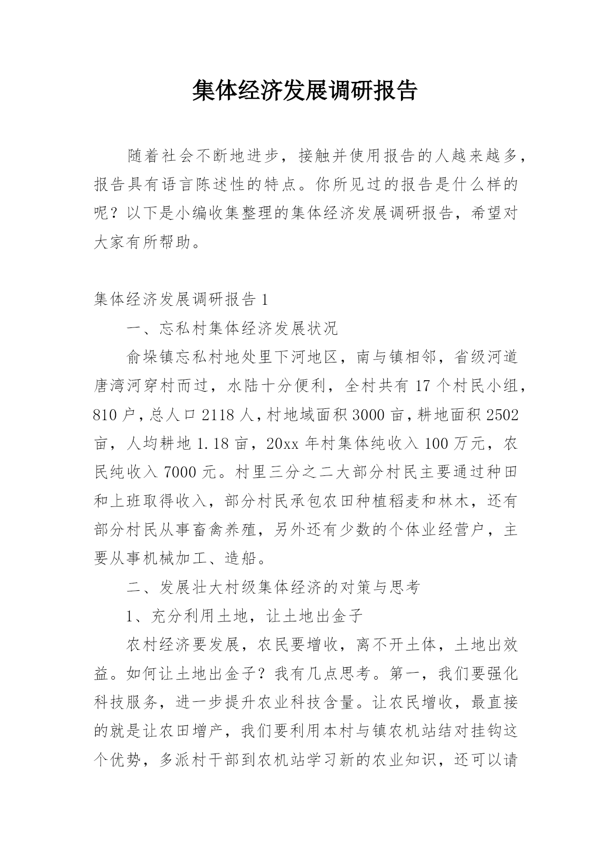 集体经济发展调研报告随着社会不断地进步,接触并使用报告的人越来越多,报告具有语言陈述性的特点。你所见过的报告是什么样的呢?以下是小编收集整理的集体经济发展调研报告,希望对大家有所帮助。集体经济发展调研报告1一、忘私村集体经济发展状况俞垛镇忘私村地处里下河地区,南与镇相邻,省级河道唐湾河穿村而过,水陆十分便利,全村共有17个村民小组,810户,总人口2118人,村地域面积3000亩,耕地面积2502亩,人均耕地1.18亩,20xx年村集体纯收入100万元,农民纯收入7000元。村里三分之二大部分村民主要通过