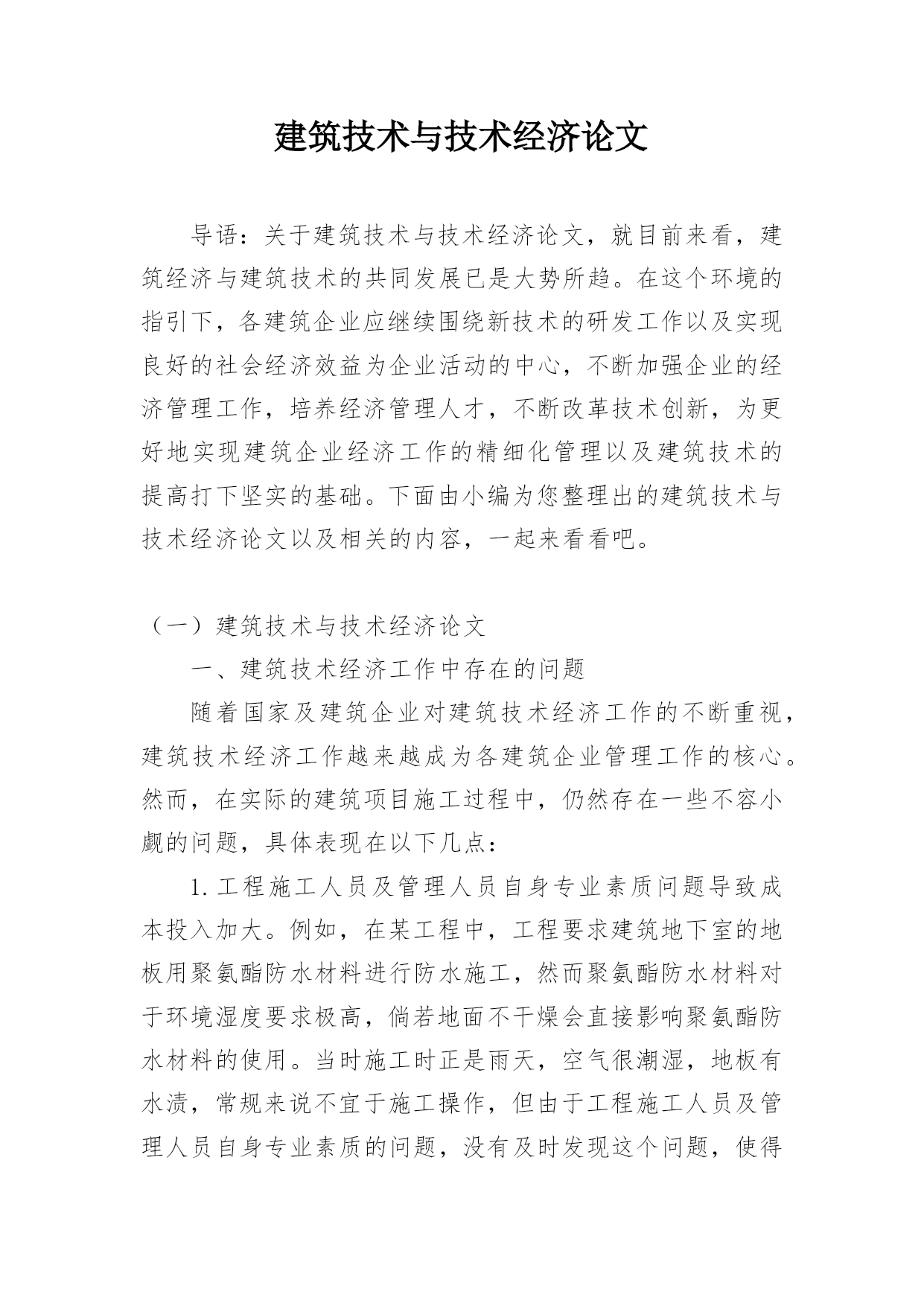 建筑技术与技术经济论文导语:关于建筑技术与技术经济论文,就目前来看,建筑经济与建筑技术的共同发展已是大势所趋。在这个环境的指引下,各建筑企业应继续围绕新技术的研发工作以及实现良好的社会经济效益为企业活动的中心,不断加强企业的经济管理工作,培养经济管理人才,不断改革技术创新,为更好地实现建筑企业经济工作的精细化管理以及建筑技术的提高打下坚实的基础。下面由小编为您整理出的建筑技术与技术经济论文以及相关的内容,一起来看看吧。(一)建筑技术与技术经济论文一、建筑技术经济工作中存在的问题随着国家及建筑企业对建筑技术