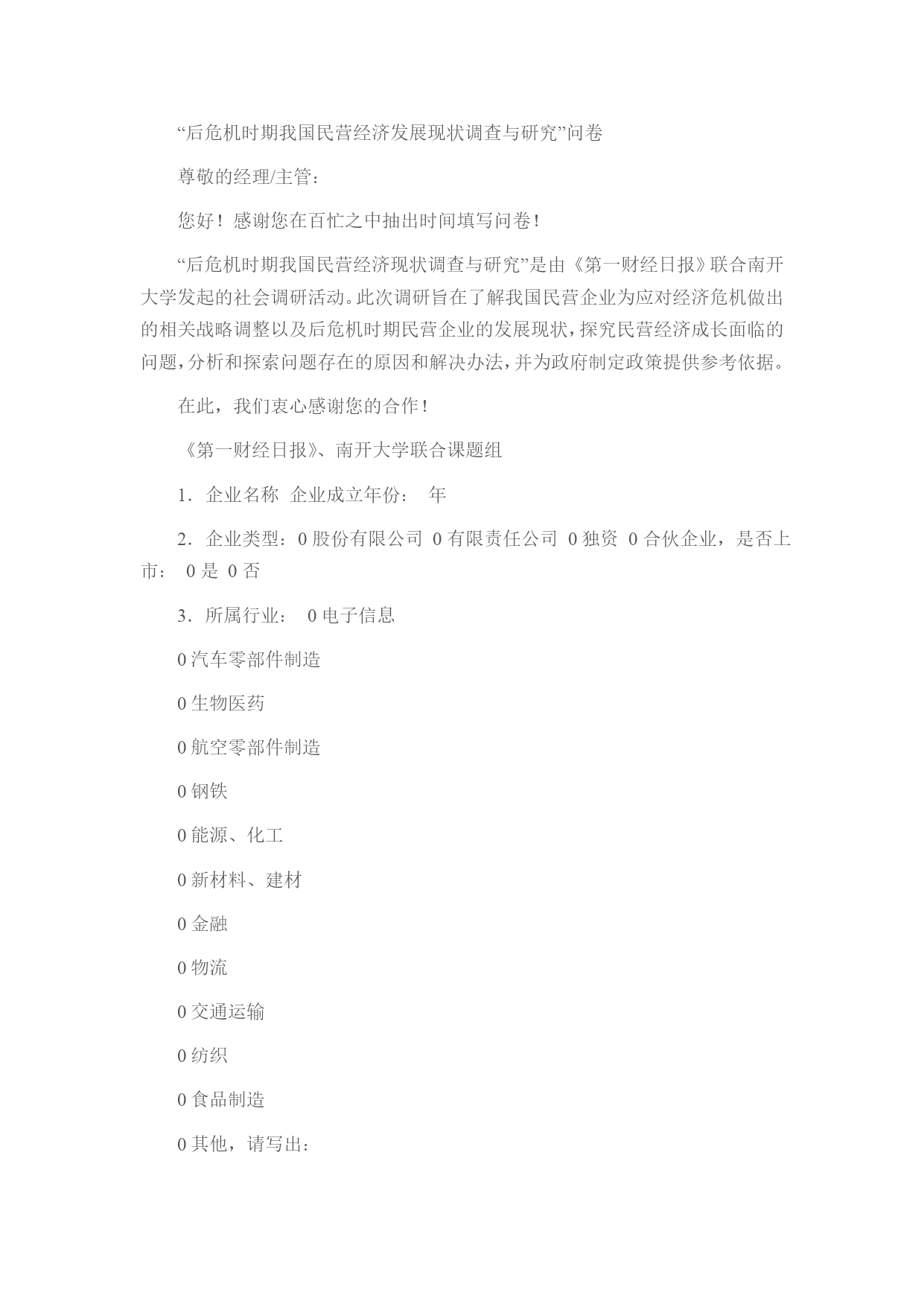 “后危机时期我国民营经济发展现状调查与研究”问卷尊敬的经理/主管:您好!感谢您在百忙之中抽出时间填写问卷!“后危机时期我国民营经济现状调查与研究”是由《第一财经日报》联合南开大学发起的社会调研活动。此次调研旨在了解我国民营企业为应对经济危机做出的相关战略调整以及后危机时期民营企业的发展现状,探究民营经济成长面临的问题,分析和探索问题存在的原因和解决办法,并为政府制定政策提供参考依据。在此,我们衷心感谢您的合作!《第一财经日报》、南开大学联合课题组1.企业名称企业成立年份:年2.企业类型:0股份有限公司0有