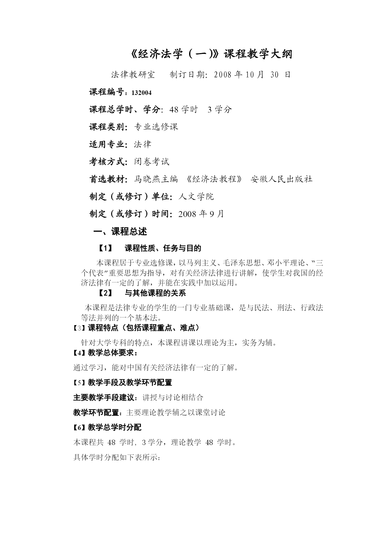 《经济法学(一)》课程教学大纲法律教研室制订日期:2008年10月30日课程编号:132004课程总学时、学分:48学时3学分课程类别:专业选修课适用专业:法律考核方式:闭卷考试首选教材:马晓燕主编《经济法教程》安徽人民出版社制定(或修订)单位:人文学院制定(或修订)时间:2008年9月一、课程总述课程性质、任务与目的本课程居于专业选修课,以马列主义、毛泽东思想、邓小平理论、“三个代表”重要思想为指导,对有关经济法律进行讲解,使学生对我国的经济法律有一定的了解,并能在实践中加以运用。与其他课程的关系本课程