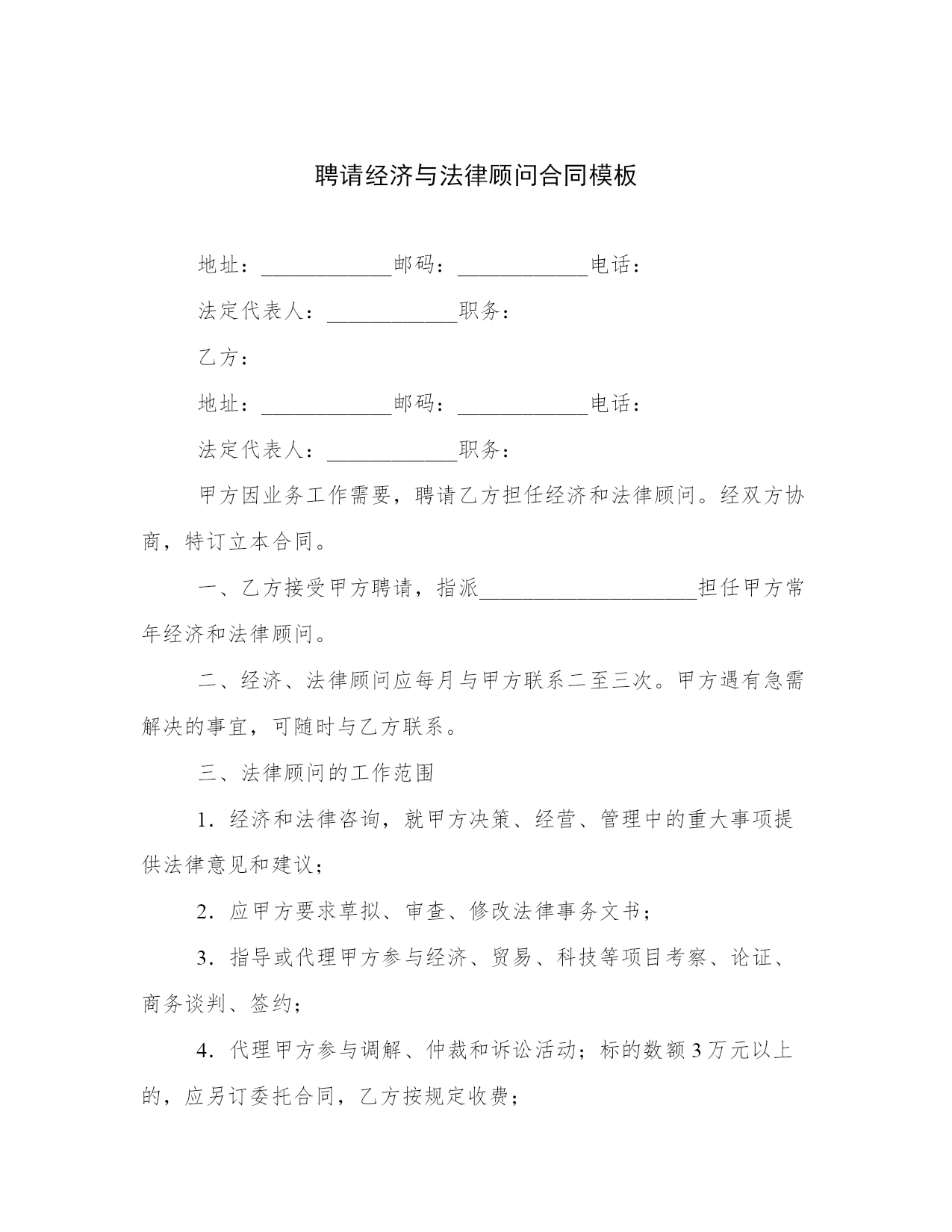 聘请经济与法律顾问合同模板地址:____________邮码:____________电话:法定代表人:____________职务:乙方:地址:____________邮码:____________电话:法定代表人:____________职务:甲方因业务工作需要,聘请乙方担任经济和法律顾问。经双方协商,特订立本合同。一、乙方接受甲方聘请,指派____________________担任甲方常年经济和法律顾问。二、经济、法律顾问应每月与甲方联系二至三次。甲方遇有急需解决的事宜,可随时与乙方联系。三、法律