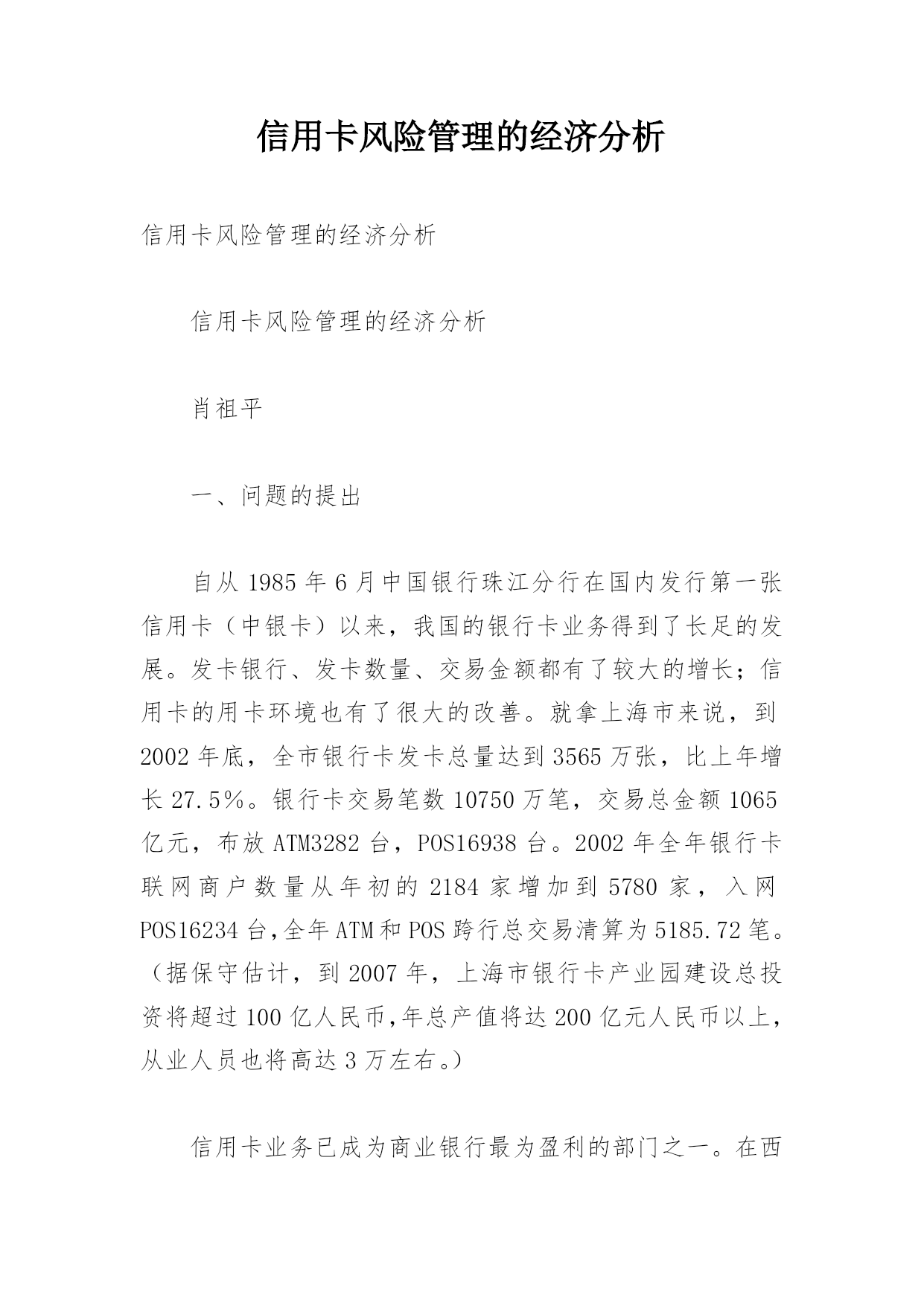 信用卡风险管理的经济分析信用卡风险管理的经济分析信用卡风险管理的经济分析肖祖平一、问题的提出自从1985年6月中国银行珠江分行在国内发行第一张信用卡(中银卡)以来,我国的银行卡业务得到了长足的发展。发卡银行、发卡数量、交易金额都有了较大的增长;信用卡的用卡环境也有了很大的改善。就拿上海市来说,到2002年底,全市银行卡发卡总量达到3565万张,比上年增长27.5%。银行卡交易笔数10750万笔,交易总金额1065亿元,布放ATM3282台,POS16938台。2002年全年银行卡联网商户数量从年初的218