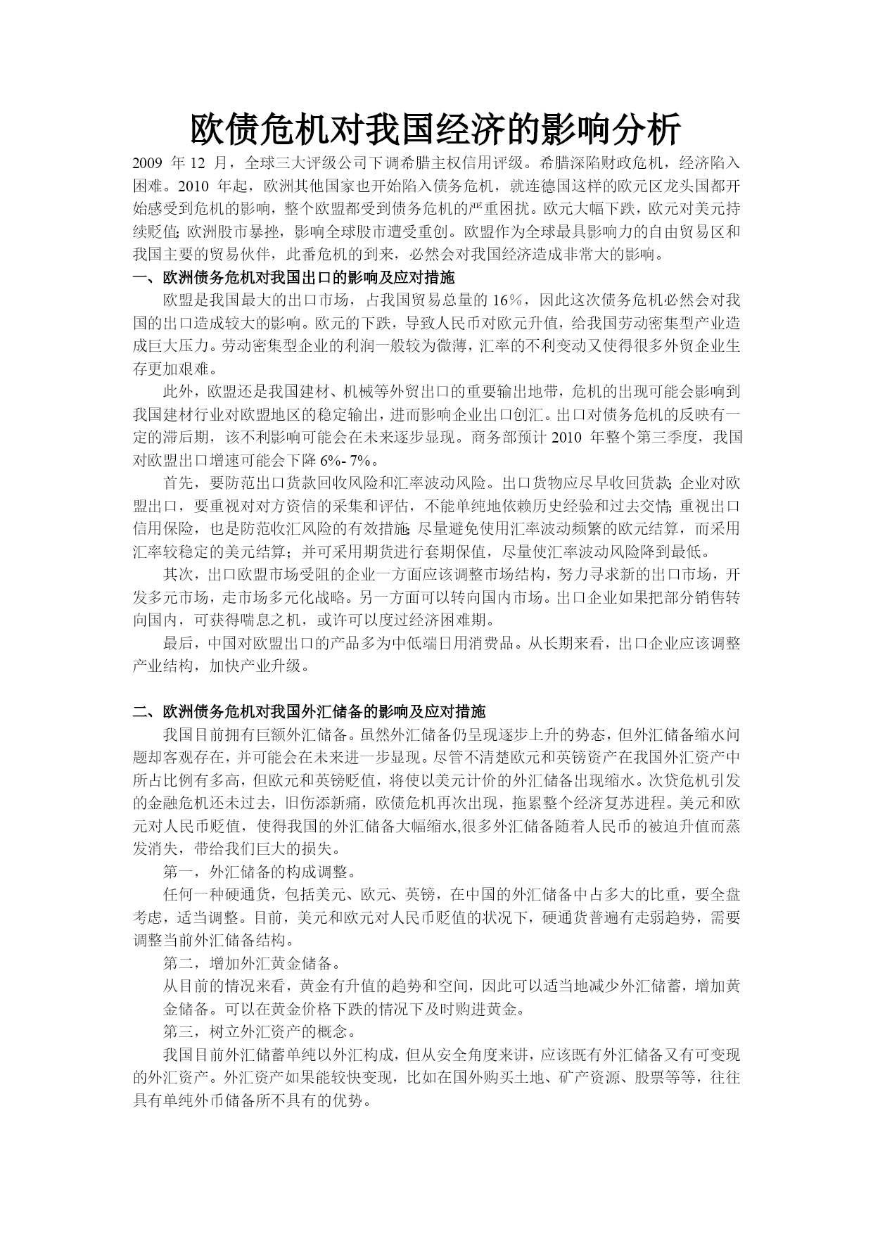 欧债危机对我国经济的影响分析2009年12月,全球三大评级公司下调希腊主权信用评级。希腊深陷财政危机,经济陷入困难。2010年起,欧洲其他国家也开始陷入债务危机,就连德国这样的欧元区龙头国都开始感受到危机的影响,整个欧盟都受到债务危机的严重困扰。欧元大幅下跌,欧元对美元持续贬值;欧洲股市暴挫,影响全球股市遭受重创。欧盟作为全球最具影响力的自由贸易区和我国主要的贸易伙伴,此番危机的到来,必然会对我国经济造成非常大的影响。一、欧洲债务危机对我国出口的影响及应对措施欧盟是我国最大的出口市场,占我国贸易总量的16