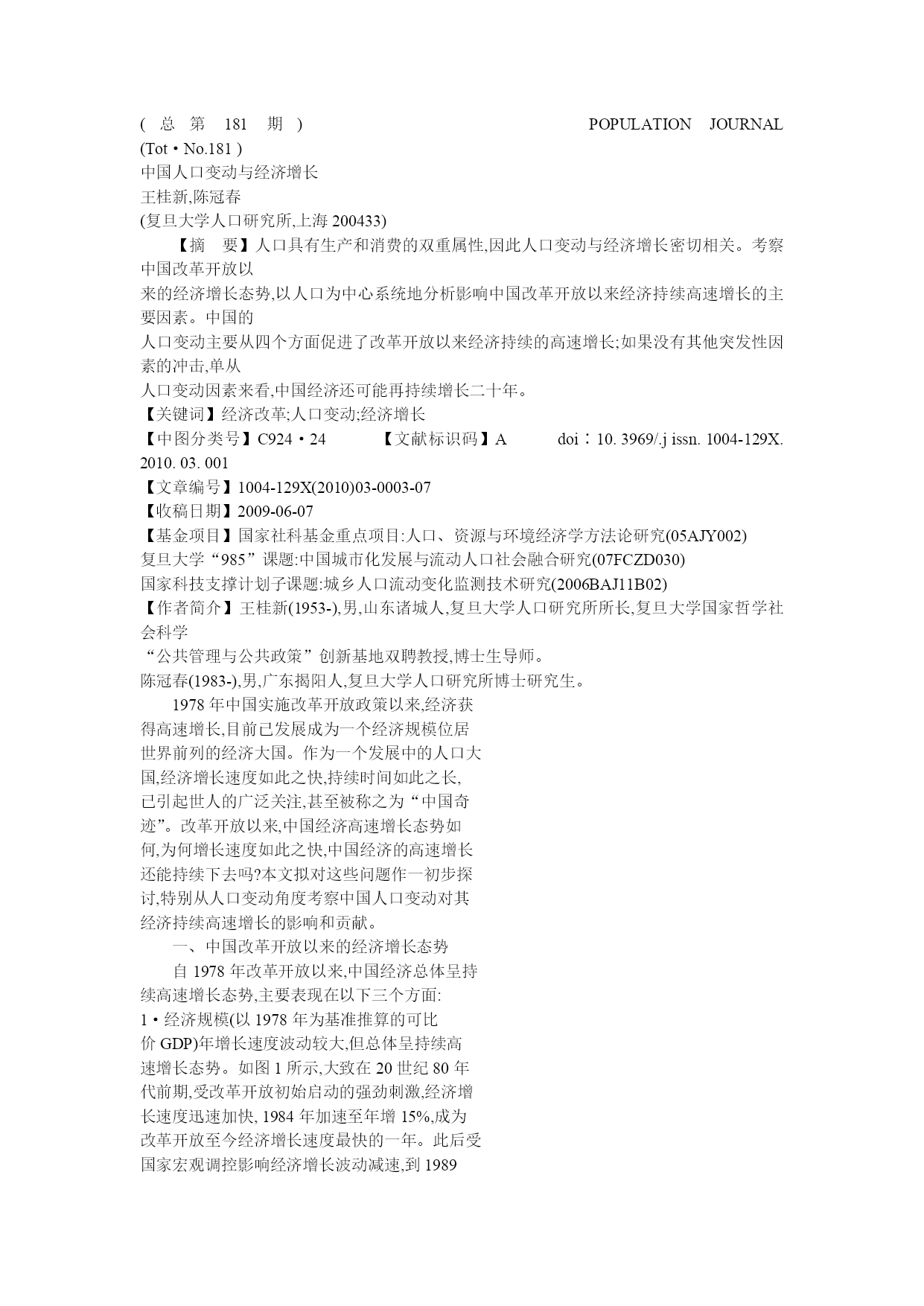 (总第181期)POPULATIONJOURNAL(Tot·No.181)中国人口变动与经济增长王桂新,陈冠春(复旦大学人口研究所,上海200433)【摘要】人口具有生产和消费的双重属性,因此人口变动与经济增长密切相关。考察中国改革开放以来的经济增长态势,以人口为中心系统地分析影响中国改革开放以来经济持续高速增长的主要因素。中国的人口变动主要从四个方面促进了改革开放以来经济持续的高速增长;如果没有其他突发性因素的冲击,单从人口变动因素来看,中国经济还可能再持续增长二十年。【关键词】经济改革;人口变动;经济