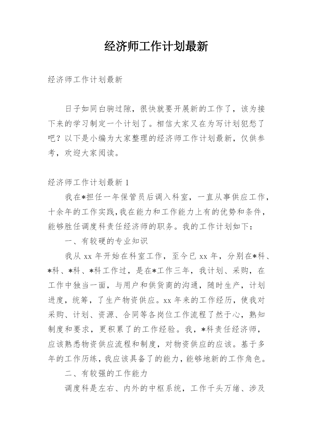 经济师工作计划最新经济师工作计划最新日子如同白驹过隙,很快就要开展新的工作了,该为接下来的学习制定一个计划了。相信大家又在为写计划犯愁了吧?以下是小编为大家整理的经济师工作计划最新,仅供参考,欢迎大家阅读。经济师工作计划最新1我在*担任一年保管员后调入科室,一直从事供应工作,十余年的工作实践,我在能力和工作能力上有的优势和条件,能够胜任调度科责任经济师的职务。我的工作计划如下:一、有较硬的专业知识我从xx年开始在科室工作,至今已xx年,分别在*科、*科、*科、*科工作过,是在*工作三年,我计划、采购,在工