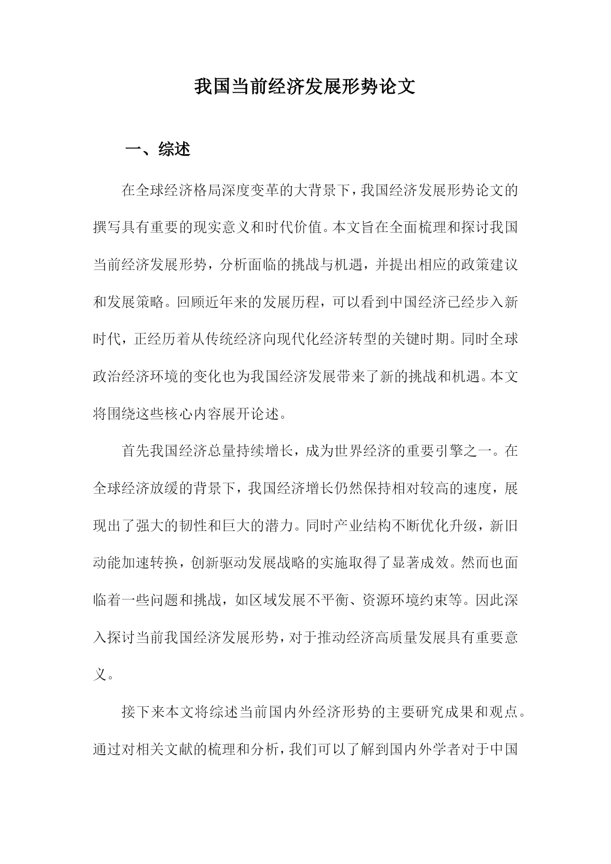 我国当前经济发展形势论文一、综述在全球经济格局深度变革的大背景下,我国经济发展形势论文的撰写具有重要的现实意义和时代价值。本文旨在全面梳理和探讨我国当前经济发展形势,分析面临的挑战与机遇,并提出相应的政策建议和发展策略。回顾近年来的发展历程,可以看到中国经济已经步入新时代,正经历着从传统经济向现代化经济转型的关键时期。同时全球政治经济环境的变化也为我国经济发展带来了新的挑战和机遇。本文将围绕这些核心内容展开论述。首先我国经济总量持续增长,成为世界经济的重要引擎之一。在全球经济放缓的背景下,我国经济增长仍然