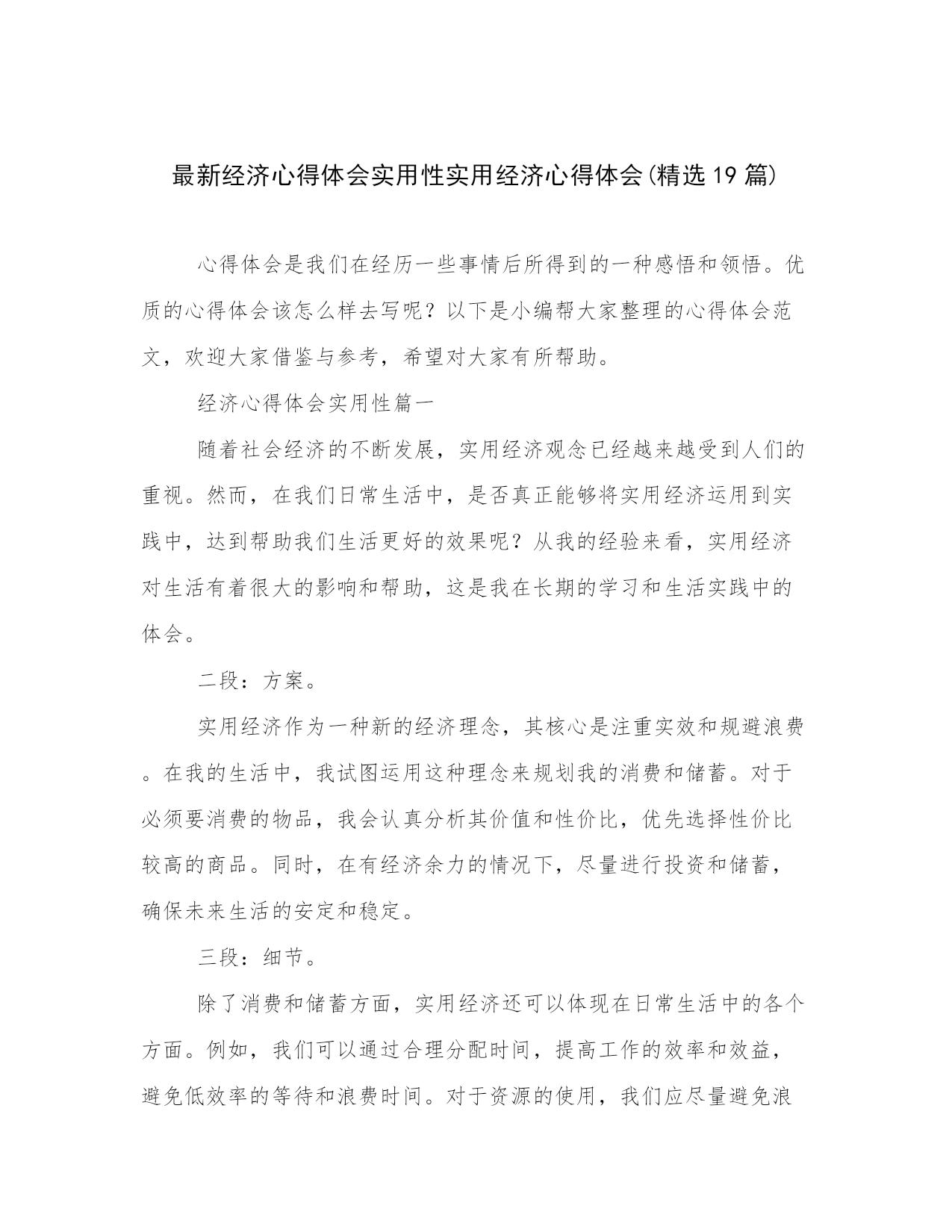 最新经济心得体会实用性实用经济心得体会(精选19篇)心得体会是我们在经历一些事情后所得到的一种感悟和领悟。优质的心得体会该怎么样去写呢?以下是小编帮大家整理的心得体会范文,欢迎大家借鉴与参考,希望对大家有所帮助。经济心得体会实用性篇一随着社会经济的不断发展,实用经济观念已经越来越受到人们的重视。然而,在我们日常生活中,是否真正能够将实用经济运用到实践中,达到帮助我们生活更好的效果呢?从我的经验来看,实用经济对生活有着很大的影响和帮助,这是我在长期的学习和生活实践中的体会。二段:方案。实用经济作为一种新的经