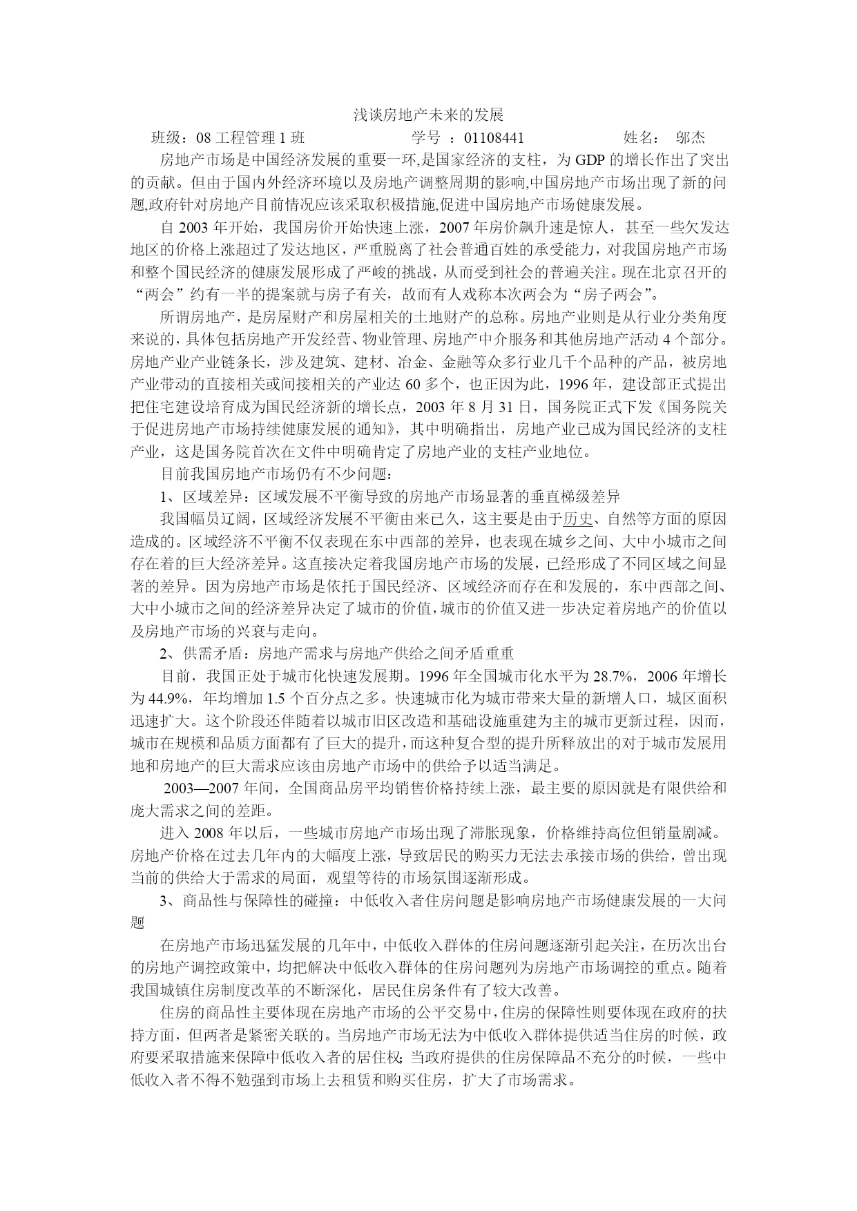 浅谈房地产未来的发展班级:08工程管理1班学号:01108441姓名:邬杰房地产市场是中国经济发展的重要一环,是国家经济的支柱,为GDP的增长作出了突出的贡献。但由于国内外经济环境以及房地产调整周期的影响,中国房地产市场出现了新的问题,政府针对房地产目前情况应该采取积极措施,促进中国房地产市场健康发展。自2003年开始,我国房价开始快速上涨,2007年房价飙升速是惊人,甚至一些欠发达地区的价格上涨超过了发达地区,严重脱离了社会普通百姓的承受能力,对我国房地产市场和整个国民经济的健康发展形成了严峻的挑战,从
