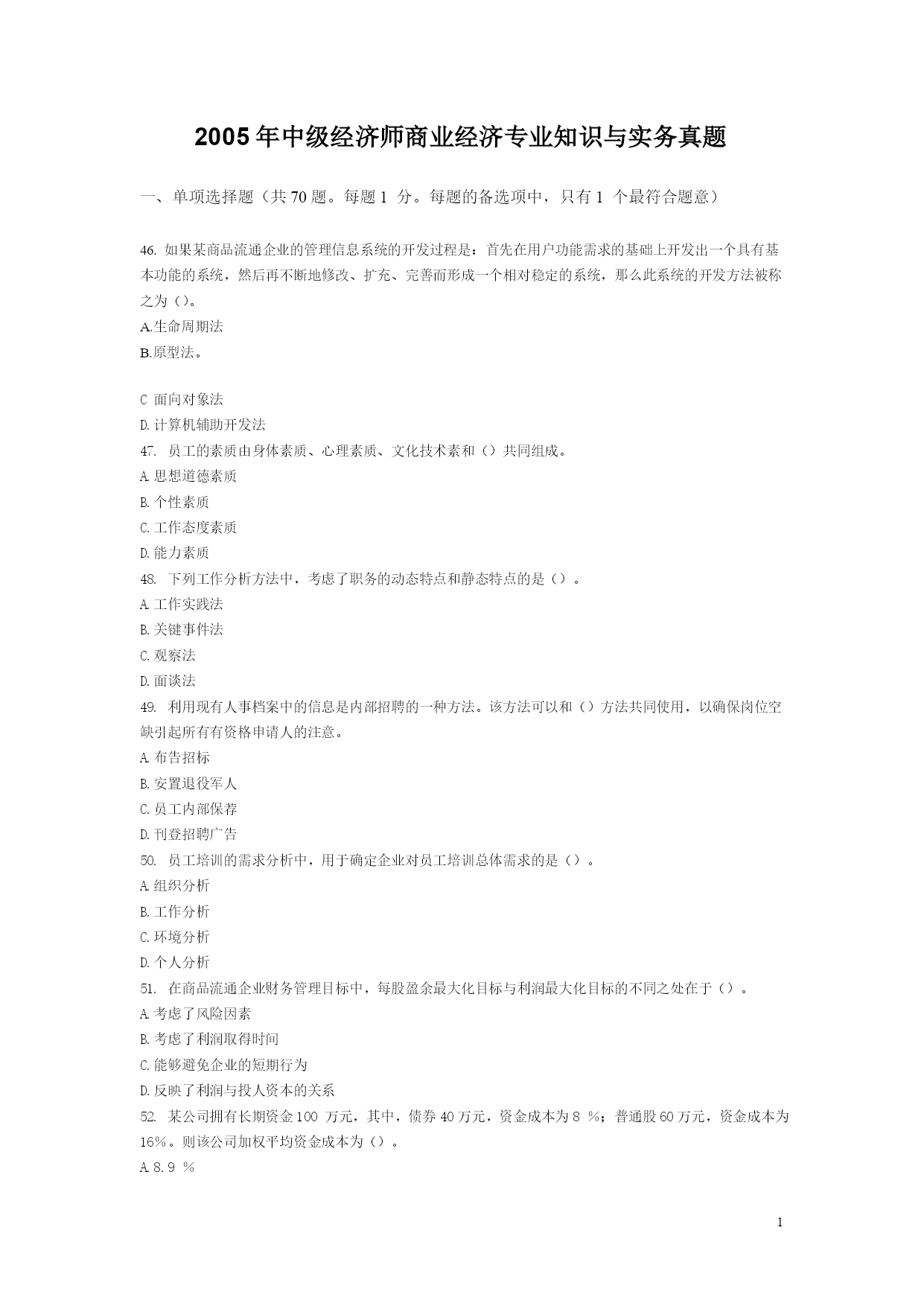 PAGEPAGE32005年中级经济师商业经济专业知识与实务真题一、单项选择题(共70题。每题1分。每题的备选项中,只有1个最符合题意)46.如果某商品流通企业的管理信息系统的开发过程是:首先在用户功能需求的基础上开发出一个具有基本功能的系统,然后再不断地修改、扩充、完善而形成一个相对稳定的系统,那么此系统的开发方法被称之为()。A.生命周期法B.原型法。C面向对象法D.计算机辅助开发法47.员工的素质由身体素质、心理素质、文化技术素和()共同组成。A.思想道德素质B.个性素质C.工作态度素质