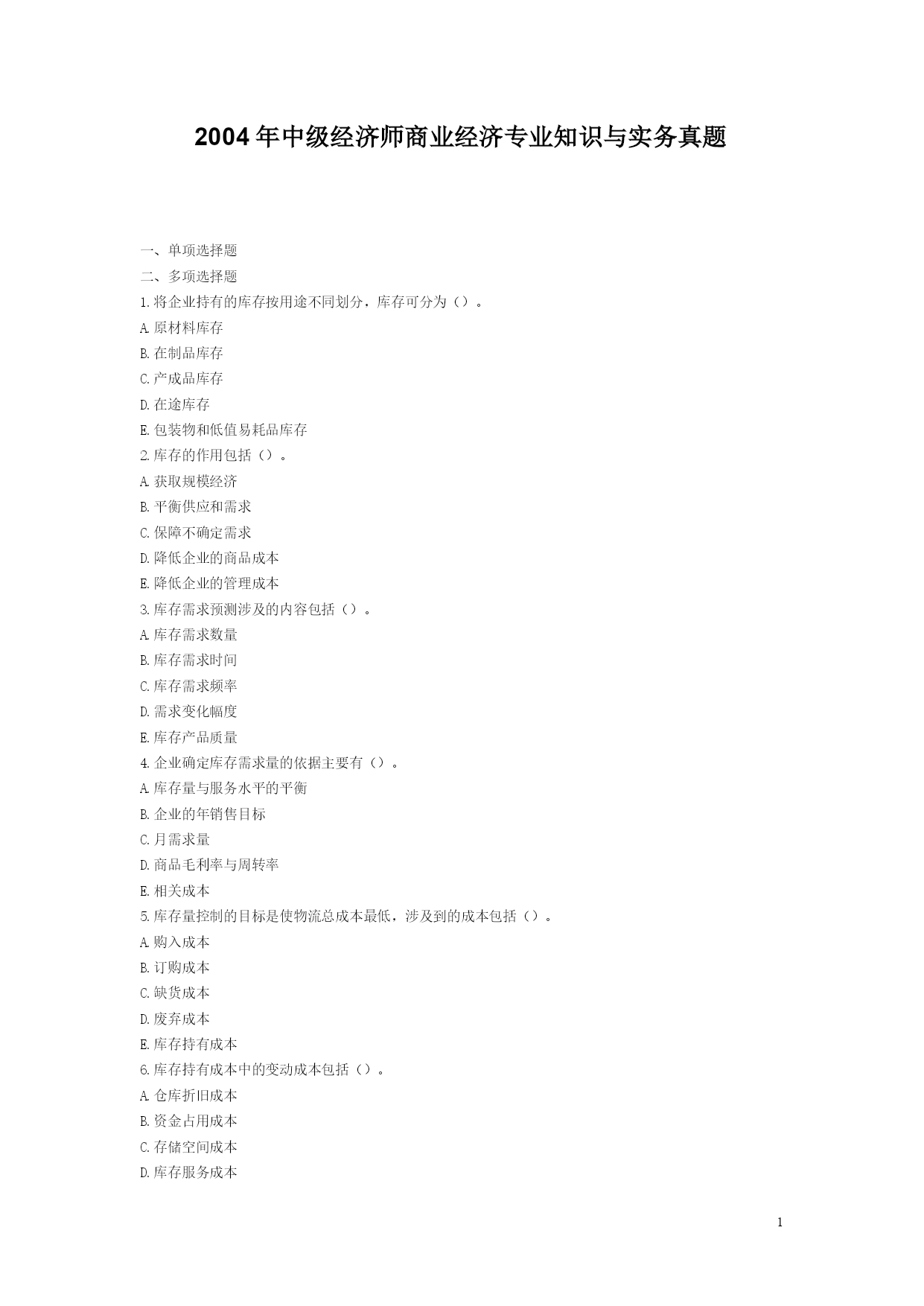 PAGEPAGE32004年中级经济师商业经济专业知识与实务真题一、单项选择题二、多项选择题1.将企业持有的库存按用途不同划分,库存可分为()。A.原材料库存B.在制品库存C.产成品库存D.在途库存E.包装物和低值易耗品库存2.库存的作用包括()。A.获取规模经济B.平衡供应和需求C.保障不确定需求D.降低企业的商品成本E.降低企业的管理成本3.库存需求预测涉及的内容包括()。A.库存需求数量B.库存需求时间C.库存需求频率D.需求变化幅度E.库存产品质量4.企业确定库存需求量的依据主要有()