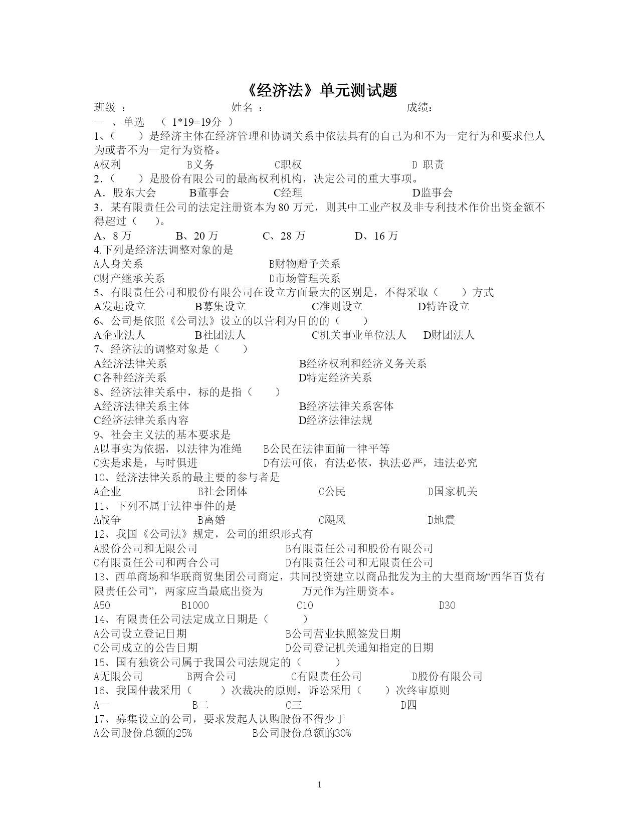PAGEPAGE4《经济法》单元测试题班级:姓名:成绩:一、单选(1*19=19分)1、()是经济主体在经济管理和协调关系中依法具有的自己为和不为一定行为和要求他人为或者不为一定行为资格。A权利B义务C职权D职责2.()是股份有限公司的最高权利机构,决定公司的重大事项。A.股东大会B董事会C经理D监事会3.某有限责任公司的法定注册资本为80万元,则其中工业产权及非专利技术作价出资金额不得超过()。A、8万B、20万C、28万D、16万4.下列是经济法调整对象的是A人身关系B财物赠予关系C财产继