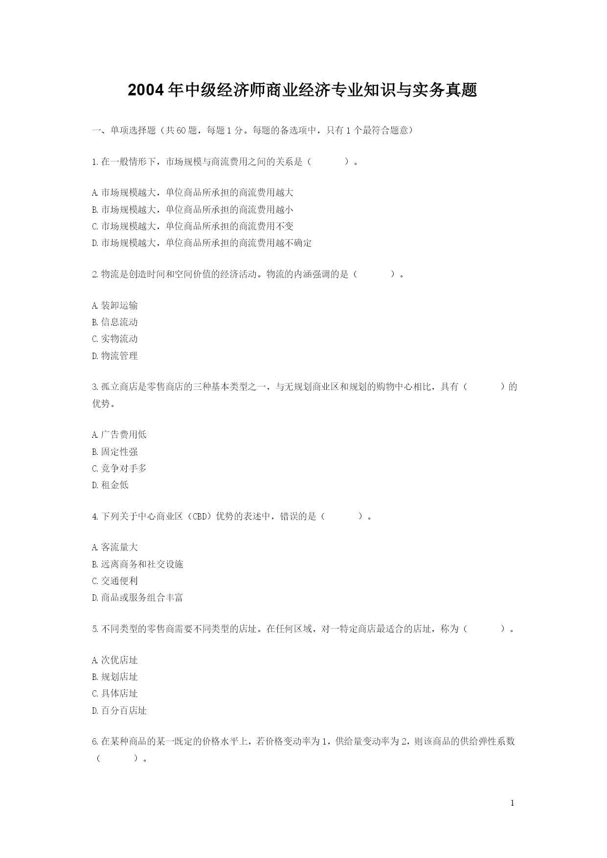 PAGEPAGE32004年中级经济师商业经济专业知识与实务真题一、单项选择题(共60题,每题1分。每题的备选项中,只有1个最符合题意)1.在一般情形下,市场规模与商流费用之间的关系是()。A.市场规模越大,单位商品所承担的商流费用越大B.市场规模越大,单位商品所承担的商流费用越小C.市场规模越大,单位商品所承担的商流费用不变D.市场规模越大,单位商品所承担的商流费用越不确定2.物流是创造时间和空间价值的经济活动。物流的内涵强调的是()。A.装卸运输B.信息流动C.实物流动D.物流管理3.孤立