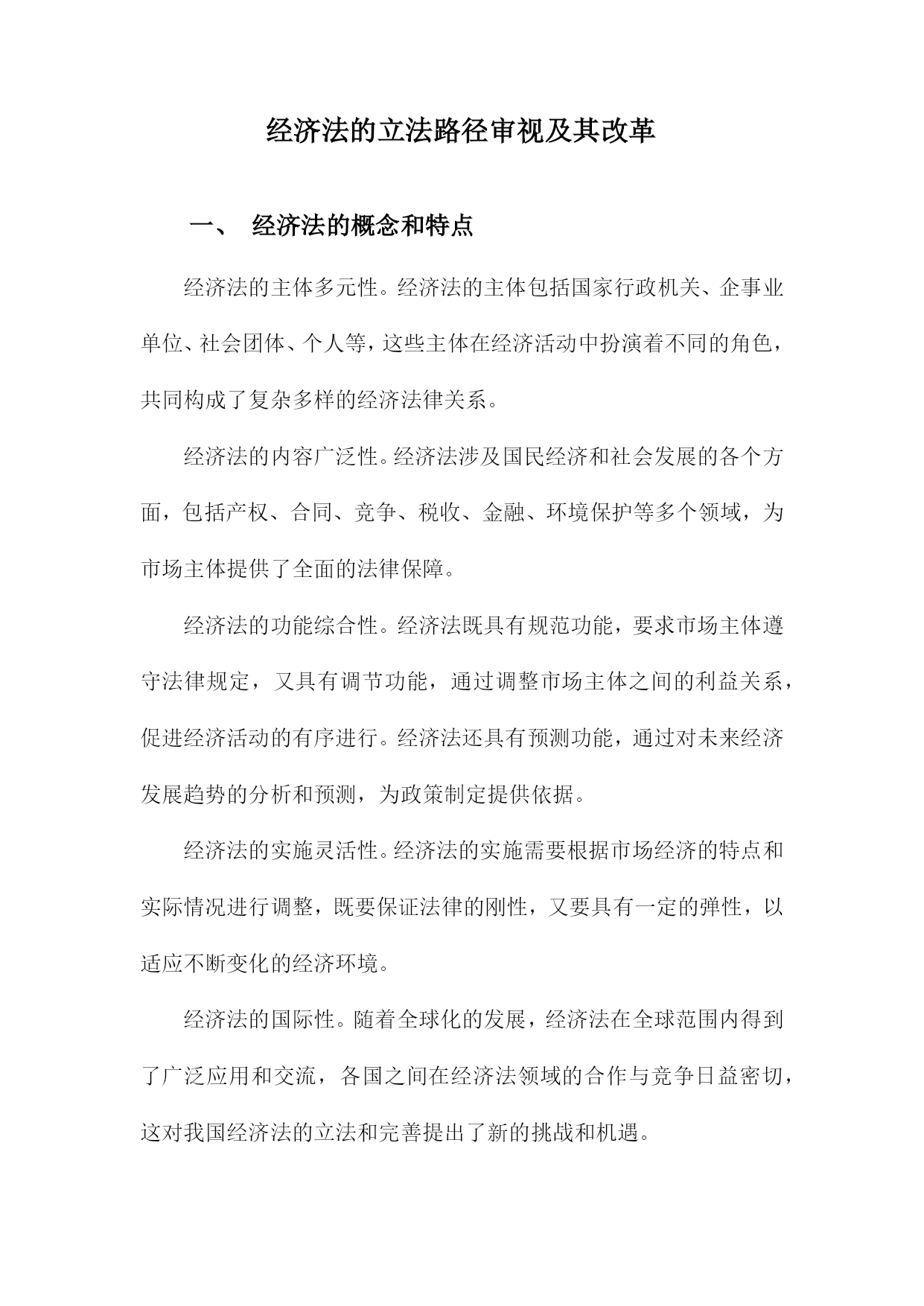 经济法的立法路径审视及其改革一、经济法的概念和特点经济法的主体多元性。经济法的主体包括国家行政机关、企事业单位、社会团体、个人等,这些主体在经济活动中扮演着不同的角色,共同构成了复杂多样的经济法律关系。经济法的内容广泛性。经济法涉及国民经济和社会发展的各个方面,包括产权、合同、竞争、税收、金融、环境保护等多个领域,为市场主体提供了全面的法律保障。经济法的功能综合性。经济法既具有规范功能,要求市场主体遵守法律规定,又具有调节功能,通过调整市场主体之间的利益关系,促进经济活动的有序进行。经济法还具有预测功能,