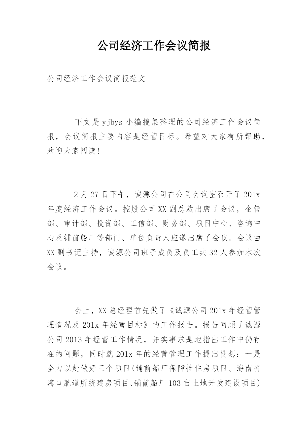 公司经济工作会议简报公司经济工作会议简报范文下文是yjbys小编搜集整理的公司经济工作会议简报,会议简报主要内容是经营目标。希望对大家有所帮助,欢迎大家阅读!2月27日下午,诚源公司在公司会议室召开了201x年度经济工作会议。控股公司XX副总裁出席了会议,企管部、审计部、投资部、工信部、财务部、项目中心、咨询中心及铺前船厂等部门、单位负责人应邀出席了会议。会议由XX副书记主持,诚源公司班子成员及员工共32人参加本次会议。会上,XX总经理首先做了《诚源公司201x年经营管理情况及201x年经营目标》的工作报