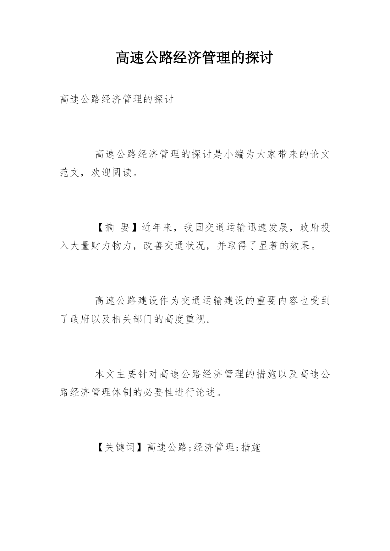 高速公路经济管理的探讨高速公路经济管理的探讨高速公路经济管理的探讨是小编为大家带来的论文范文,欢迎阅读。【摘要】近年来,我国交通运输迅速发展,政府投入大量财力物力,改善交通状况,并取得了显著的效果。高速公路建设作为交通运输建设的重要内容也受到了政府以及相关部门的高度重视。本文主要针对高速公路经济管理的措施以及高速公路经济管理体制的必要性进行论述。【关键词】高速公路;经济管理;措施随着高速公路市场改革的逐渐深入以及高速公路建设的逐渐发展,交通基础设施建设项目尤其是高速公路项目不仅投资大,而且资金相对密集,从