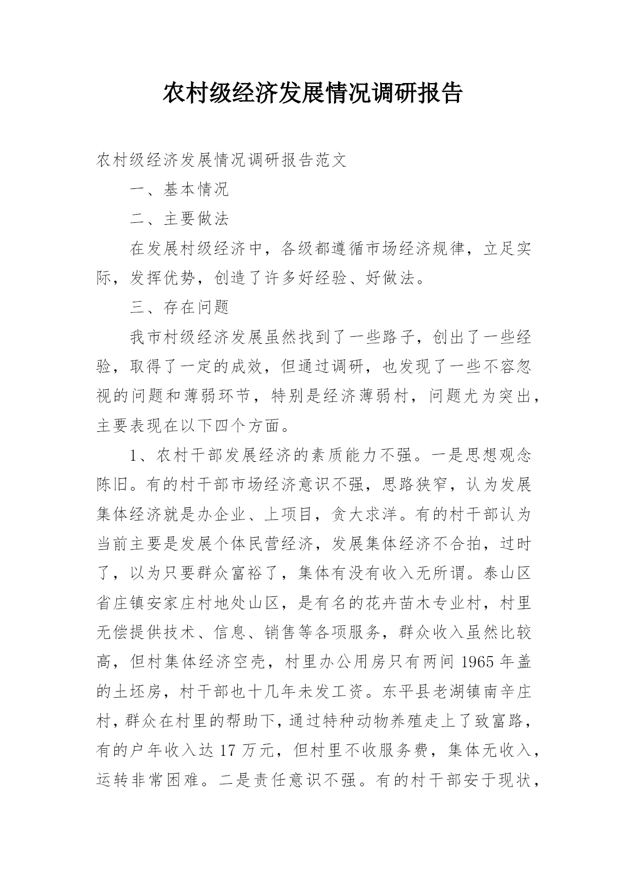 农村级经济发展情况调研报告农村级经济发展情况调研报告范文一、基本情况二、主要做法在发展村级经济中,各级都遵循市场经济规律,立足实际,发挥优势,创造了许多好经验、好做法。三、存在问题我市村级经济发展虽然找到了一些路子,创出了一些经验,取得了一定的成效,但通过调研,也发现了一些不容忽视的问题和薄弱环节,特别是经济薄弱村,问题尤为突出,主要表现在以下四个方面。1、农村干部发展经济的素质能力不强。一是思想观念陈旧。有的村干部市场经济意识不强,思路狭窄,认为发展集体经济就是办企业、上项目,贪大求洋。有的村干部认为当