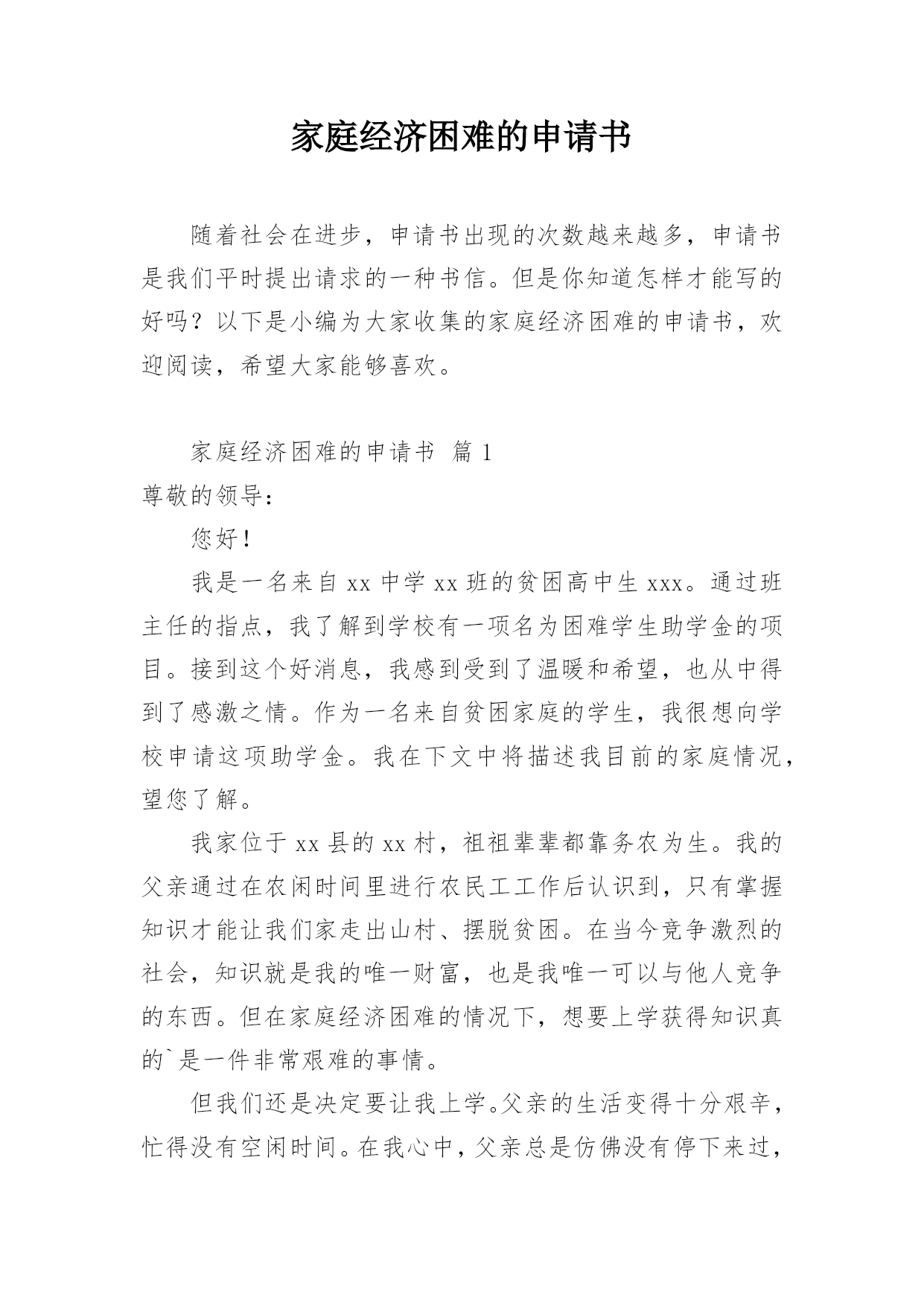 家庭经济困难的申请书随着社会在进步,申请书出现的次数越来越多,申请书是我们平时提出请求的一种书信。但是你知道怎样才能写的好吗?以下是小编为大家收集的家庭经济困难的申请书,欢迎阅读,希望大家能够喜欢。家庭经济困难的申请书篇1尊敬的领导:您好!我是一名来自xx中学xx班的贫困高中生xxx。通过班主任的指点,我了解到学校有一项名为困难学生助学金的项目。接到这个好消息,我感到受到了温暖和希望,也从中得到了感激之情。作为一名来自贫困家庭的学生,我很想向学校申请这项助学金。我在下文中将描述我目前的家庭情况,望您了解。