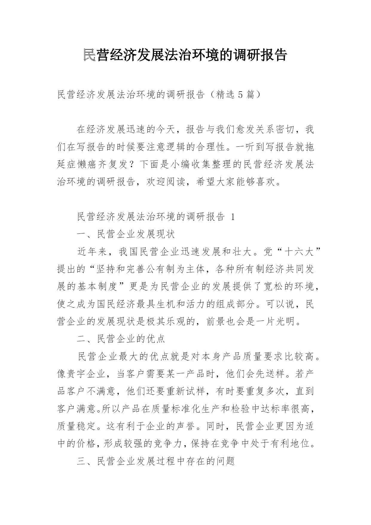 民营经济发展法治环境的调研报告民营经济发展法治环境的调研报告(精选5篇)在经济发展迅速的今天,报告与我们愈发关系密切,我们在写报告的时候要注意逻辑的合理性。一听到写报告就拖延症懒癌齐复发?下面是小编收集整理的民营经济发展法治环境的调研报告,欢迎阅读,希望大家能够喜欢。民营经济发展法治环境的调研报告1一、民营企业发展现状近年来,我国民营企业迅速发展和壮大。党“十六大”提出的“坚持和完善公有制为主体,各种所有制经济共同发展的基本制度”更是为民营企业的发展提供了宽松的环境,使之成为国民经济最具生机和活力的组成部