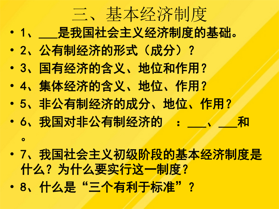 三、基本经济制度2、公有制经济的范围3、国有经济涉及国家安全的生业,如重要军工、钞票印制等说一说:我们扶绥有哪些企业是国有经济?4、集体经济有个街道办的食品厂,原来不大景气.后来实行以劳动者的劳动联合和资本联合为主的股份合作制,企业职工既是劳动者又是者,企业的重大决策都要经过员工股东大会的批准,职工的收入既与自己的劳动贡献挂钩,又与出资的数量挂钩.职工的生产积极性提高了,工厂办得红红火火.C.公有制为主体、多种所有制经济共同发该企业属于集体所有制的企业.C.公有制为主体、多种所有制经济共同发大石化、汽车集