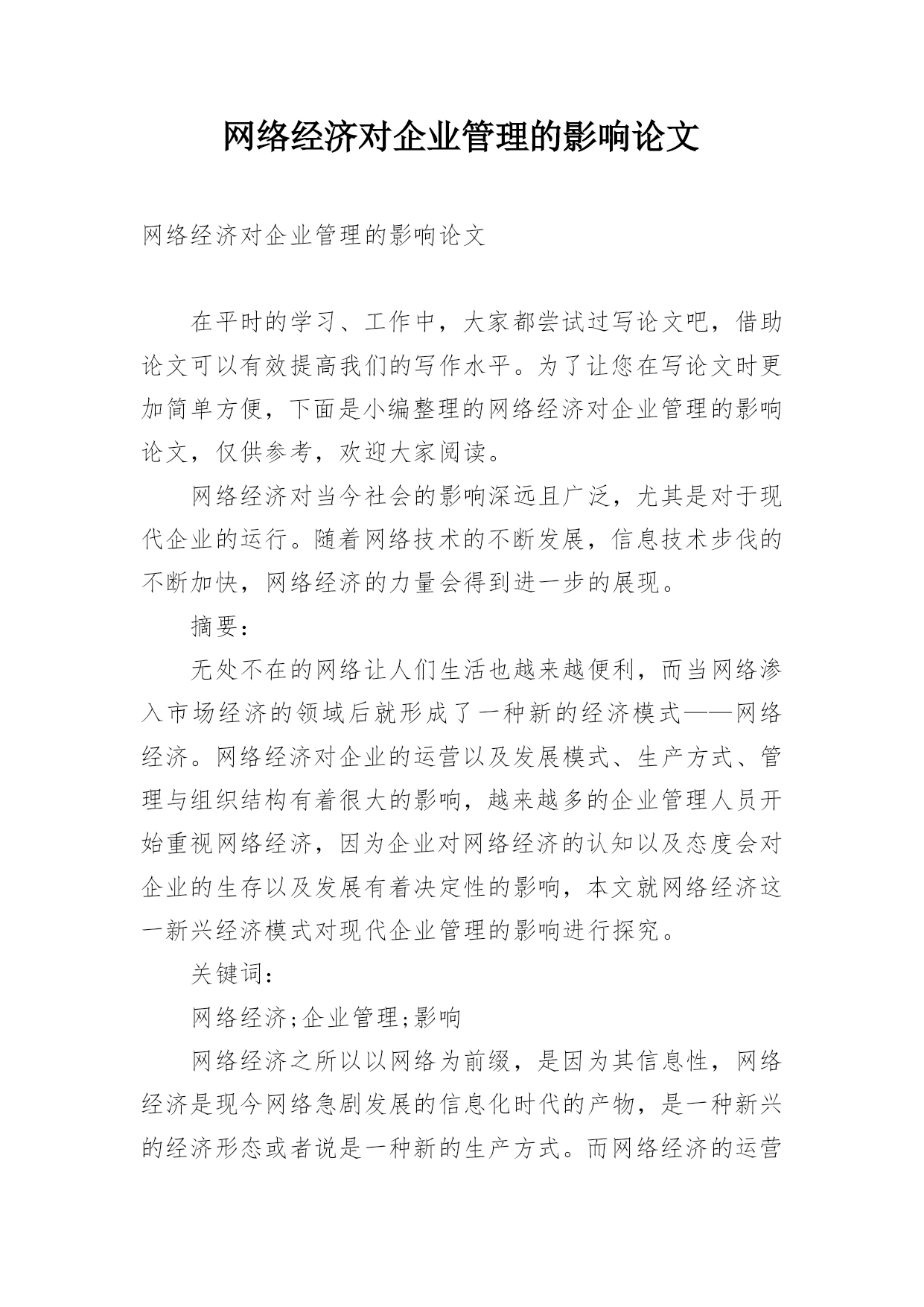 网络经济对企业管理的影响论文网络经济对企业管理的影响论文在平时的学习、工作中,大家都尝试过写论文吧,借助论文可以有效提高我们的写作水平。为了让您在写论文时更加简单方便,下面是小编整理的网络经济对企业管理的影响论文,仅供参考,欢迎大家阅读。网络经济对当今社会的影响深远且广泛,尤其是对于现代企业的运行。随着网络技术的不断发展,信息技术步伐的不断加快,网络经济的力量会得到进一步的展现。摘要:无处不在的网络让人们生活也越来越便利,而当网络渗入市场经济的领域后就形成了一种新的经济模式——网络经济。网络经济对企业的运